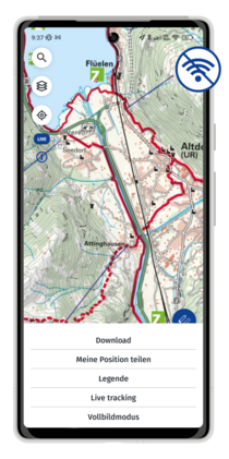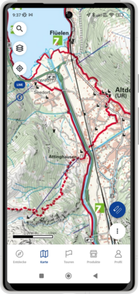 In the app, you can switch between different types of maps. You have free access to the verified quality of the Kümmerly+Frey outdoor map via the "Base map" map layer. Additionally, hiking trails and bike routes as well as the satellite view are available to our PREMIUM users.