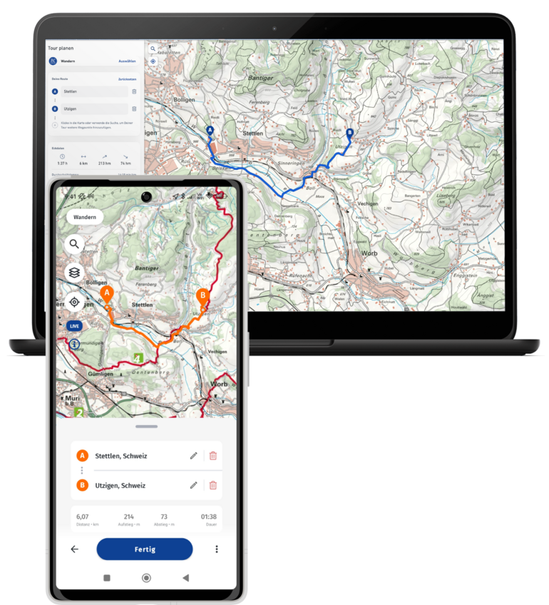 Kümmerly+Frey takes you to your destination! Plan your route yourself and save your tour for offline use* or record it on the go. Alternatively, you can plan your bike or hiking tour for free on our website and synchronize it with the app.