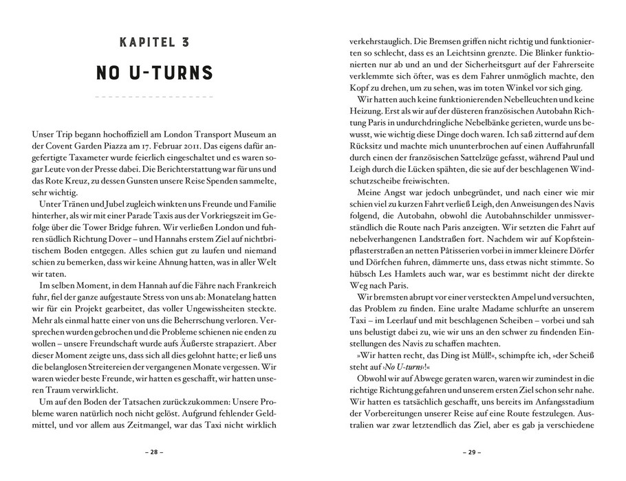 Nach einem Abend im Pub kommen die Freunde Paul, Johno und Leigh auf eine verrückte Idee: Sie kaufen ein altes schwarzes Taxi namens Hannah und gehen damit auf Weltreise – von London nach Sydney, mit dem größtmöglichen Umweg. Denn so würde es jeder Taxifahrer machen, der etwas auf sich hält. Ihr 70.000 Kilometer langer Weg führt sie in die abgelegensten und gefährlichsten Regionen: In Moskau landen sie hinter Gittern, im Iran werden sie als Spione dingfest gemacht und in Pakistan sind sie nie ohne bewaffnete Eskorte unterwegs, um nicht von den Taliban gekidnappt zu werden. Und auch das Taxi Hannah entpuppt sich als Diva, die immer wieder gepflegt und repariert werden muss. Doch die drei Freunde schaffe es mit viel Humor, allen Hindernissen zu trotzen; sie brechen zwei Weltrekorde und umrunden die ganze Erde mit ihrem alten Taxi.