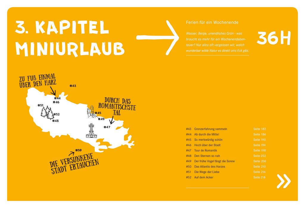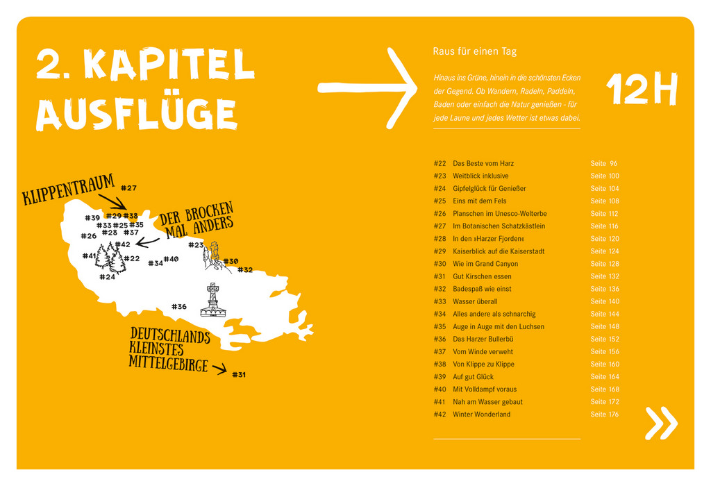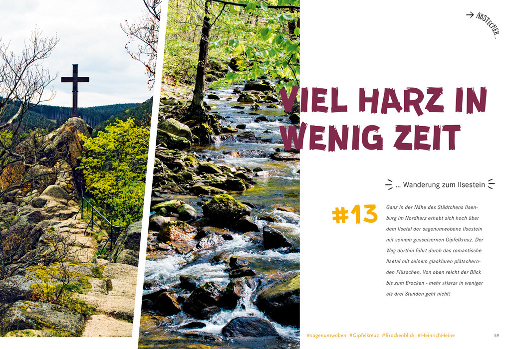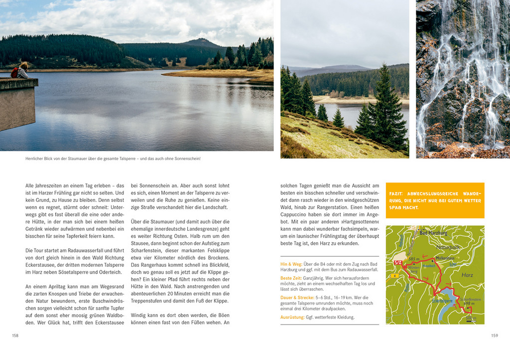 Ob wandern, radeln, paddeln oder in aller Ruhe die Natur genießen: 52 kleine und große Eskapaden machen Lust, die schönsten Ecken im Harz zu entdecken. Für wenige Stunden, einen Tag oder ein Wochenende – unwiderstehliche Ausflüge ins Grüne warten. Auf Beerenjagd gehen, Klippen erklimmen oder den Harz zu Fuß überqueren – es ist so einfach, mehr zu erleben als das Bekannte. Also ab nach draußen!