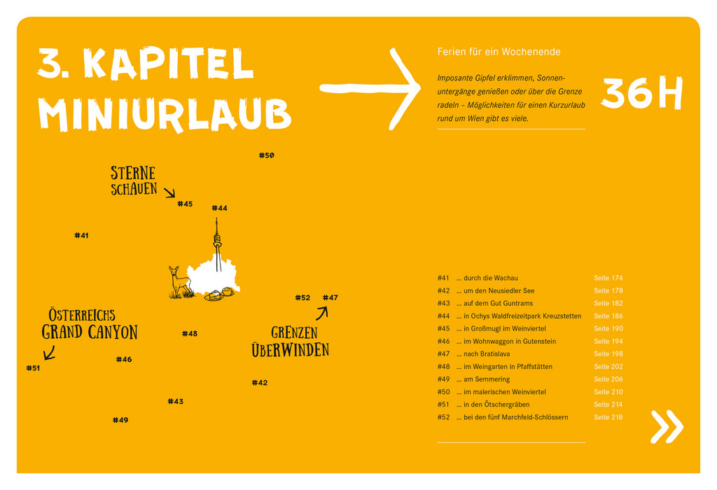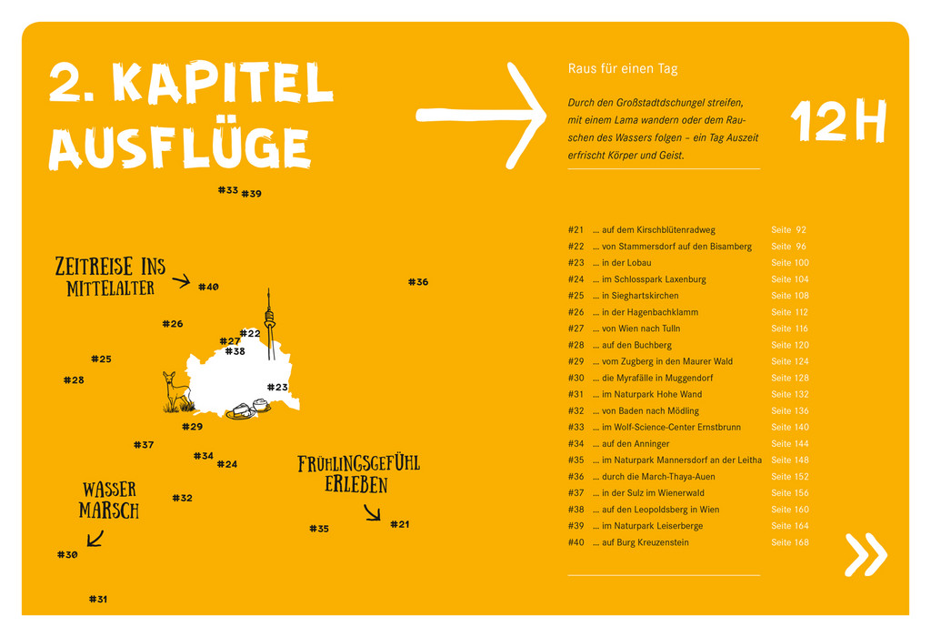 Ob wandern, radeln, paddeln oder in aller Ruhe die Natur genießen: 52 kleine und große Eskapaden machen Lust, die schönsten Ecken rund um Wien zu entdecken. Für wenige Stunden, einen Tag oder ein Wochenende – unwiderstehliche Ausflüge ins Grüne warten. Im Weingarten picknicken, mit dem Kanu die Grenze entlangpaddeln oder den funkelnden Sternenhimmel beobachten – es ist so einfach, mehr zu erleben als das Bekannte. Also ab nach draußen!