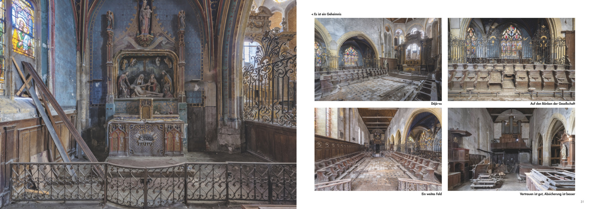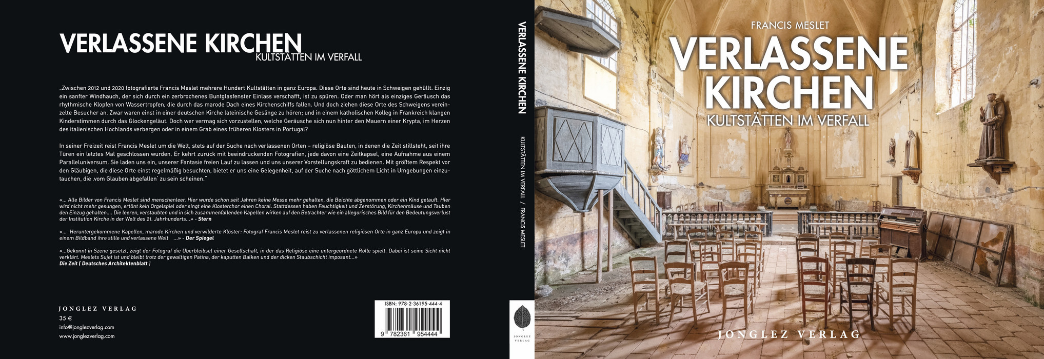 Zwischen 2012 und 2019 fotografierte Francis Meslet mehrere Hundert Kultstätten in ganz Europa. Diese Orte hüllen sich heute in Schweigen, mit einem Windhauch, der durch ein zerbrochenes Buntglasfenster zieht, oder dem rhythmischen Tropfen des Wassers, das durch das marode Dach eines Kirchenschiffs fällt, als einzig vernehmbaren Geräuschen. Und doch ziehen diese schweigenden Orte vereinzelte Besucher an. In einer deutschen Kirche waren einst lateinische Gesänge zu hören; und in einem katholischen Kolleg in Frankreich klangen Kinderstimmen durch das Läuten der Glocken. Wer jedoch vermag sich vorzustellen, welche Geräusche sich hinter den Mauern einer Krypta im Herzen des italienischen Hochlands verbergen oder in einem Grab eines früheren Klosters in Portugal?