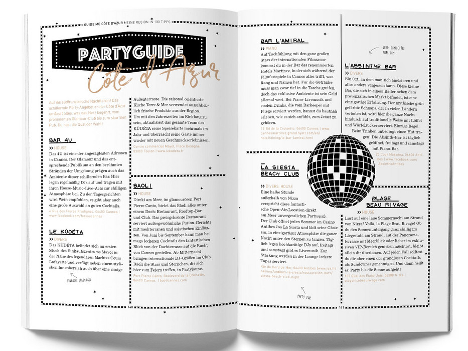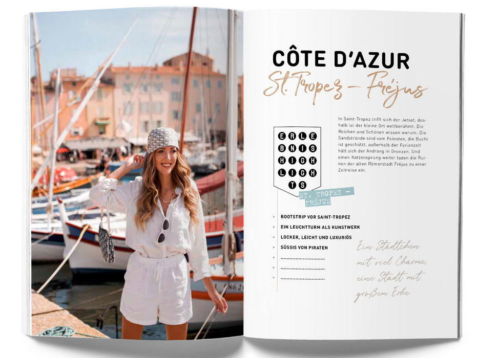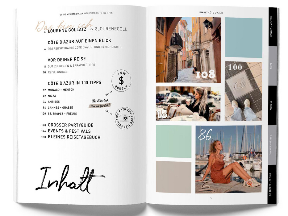 Der Reiseführer einer neuen Generation mit 100 kompakten Tipps. Die Travel-Bloggerin Lourene Gollatz zeigt dir ihre Lieblingsregion Côte d’Azur, und verrät an welcher Ecke man den perfekten Schnappschuss macht oder wo die Açai Bowl am besten schmeckt! Gepaart mit den typischen Must-See-Sights erlebst du die Côte d’Azur mit diesem Reiseführer einmal ganz anders. Und eins ist garantiert: Dein Instagram-Feed wird heißlaufen! Im modernen Design, mit individuellen Illustrationen und freien Kreativ-Seiten ist deer GuideMe Reiseführer Côte d‘Azur dabei auch ein echter Hingucker und stylischer Begleiter.