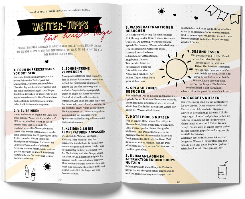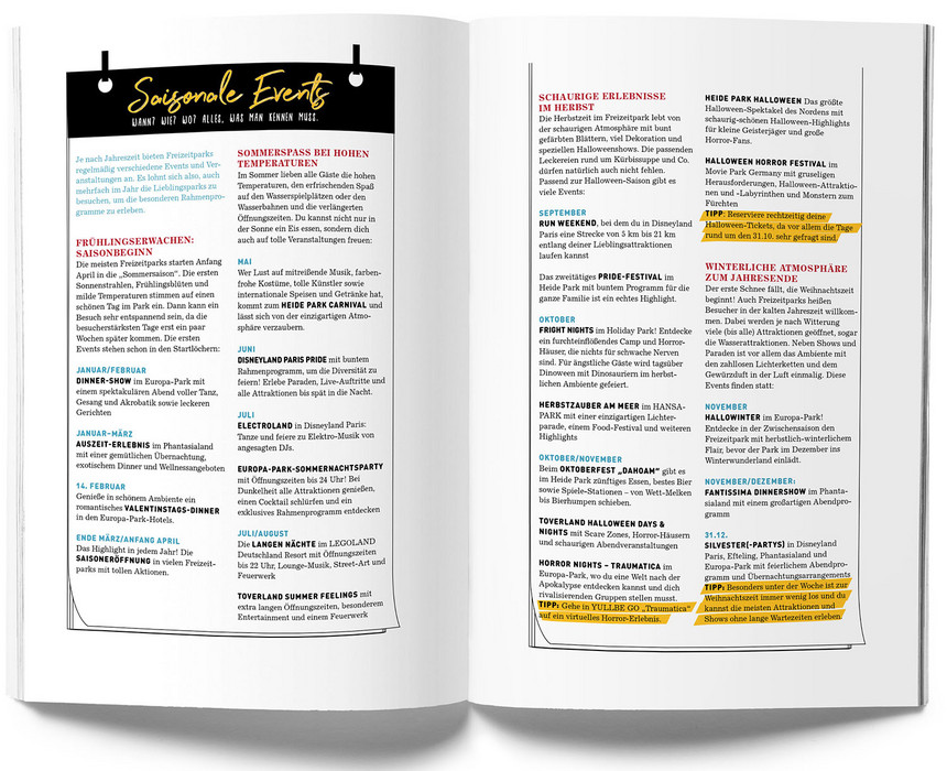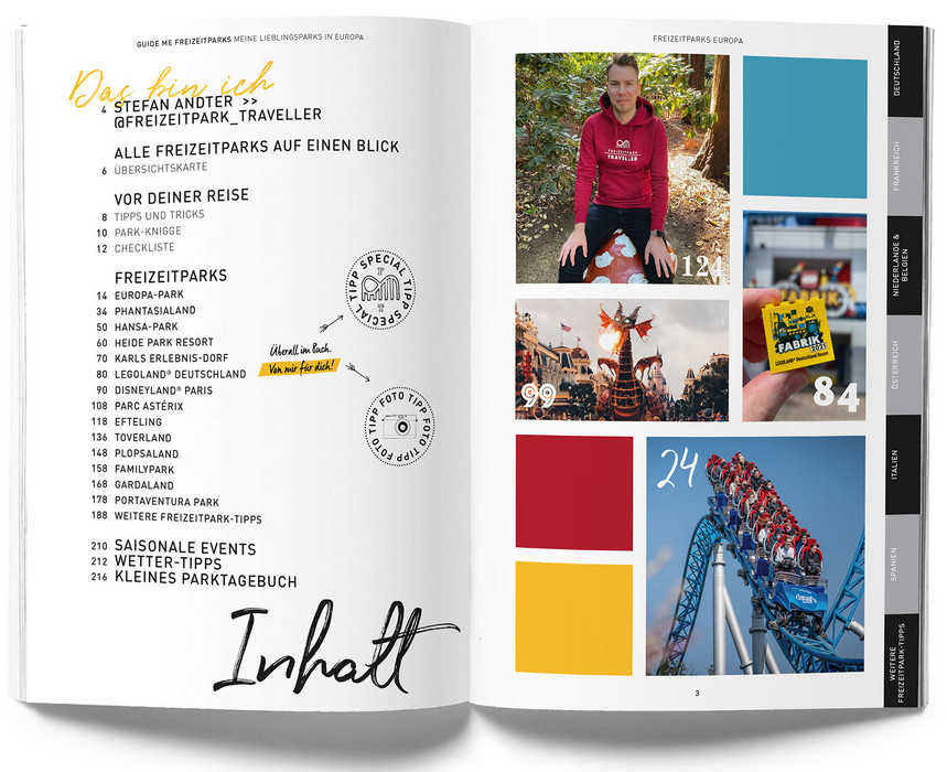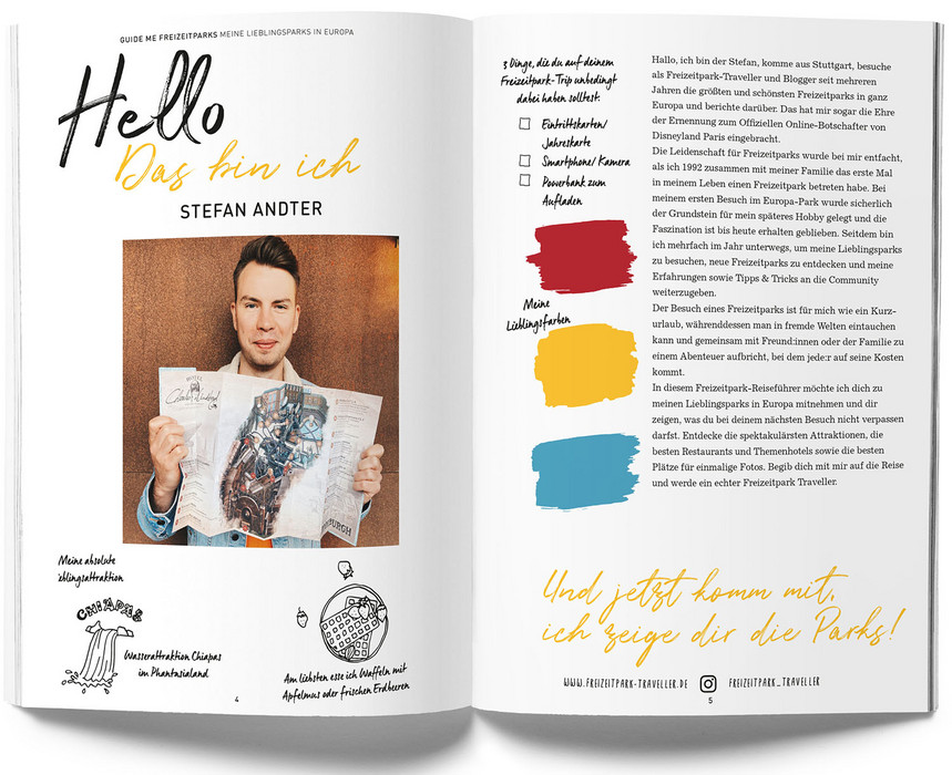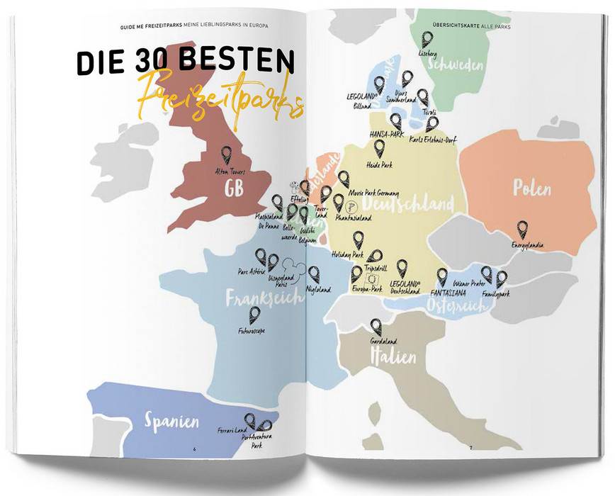Freizeitparkführer für die besten 30 Freizeitparks in Europa. Entdecke die aufregendsten Freizeitparks in ganz Europa und erlebe das ultimative Freizeitparkgvergnügen mithilfe einzigartiger Special-Tipps & Tricks unseres Freizeitpark Travellers. Unser Freizeitpark-Blogger zeigt uns seine persönlichen Lieblingsattraktionen und verrät, an welchen Ecken der perfekte Foto-Spot zu finden ist oder wo es die leckersten Snacks für zwischendurch gibt. Gepaart mit praktischen Checklisten, interessanten Backstage-Stories, Bucket-Lists, Übersichtsseiten und Event-Tipps holst Du mit dem Freizeitparkführer das Maximale aus Deinem Tag im Freizeitpark heraus. Im modernen Design, mit individuellen Illustrationen ist der Freizeitparkführer dabei auch ein echter Hingucker. Übersichtsseiten der Parks | Bucket-Lists zu den einzelnen Freizeitparks | Infos zu den besten Freizeitpark-Events | Blogger-Tipps | Foto-Hotspots | Saisonale-Tipps | Checklisten |Freizeitpark-Knigge & wichtige Begriffe | Restaurants, Cafés & Snackstände | Kreativ-Teil zum selber ausfüllen | freie Seiten zum Erinnerungen festhalten > GESTALTE dein individuelles Bullet-Journal auf freien Seiten.