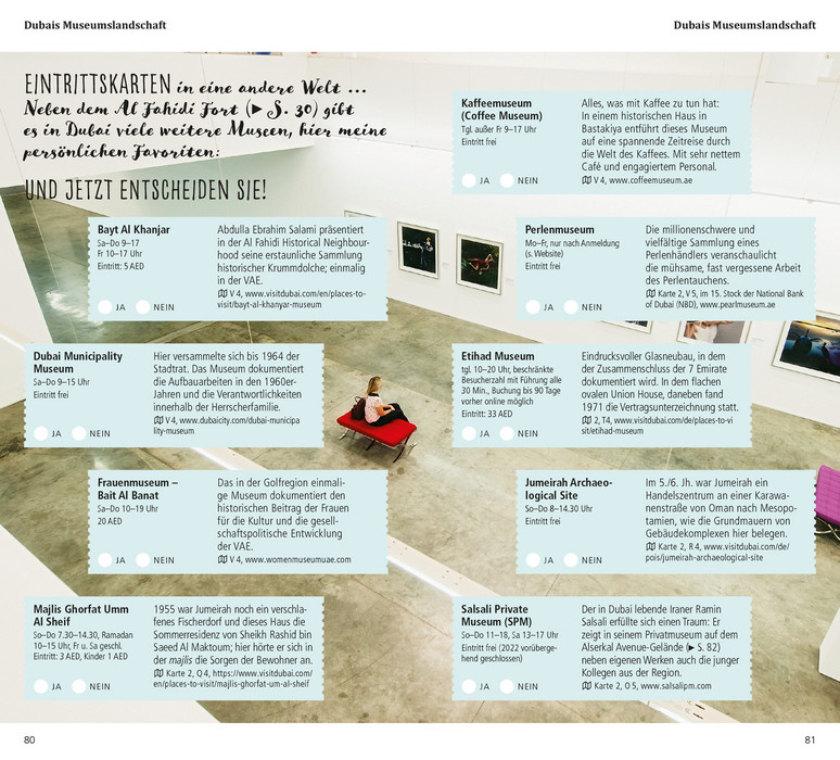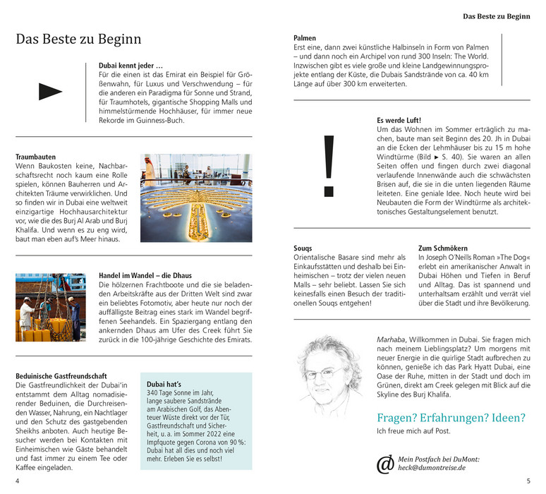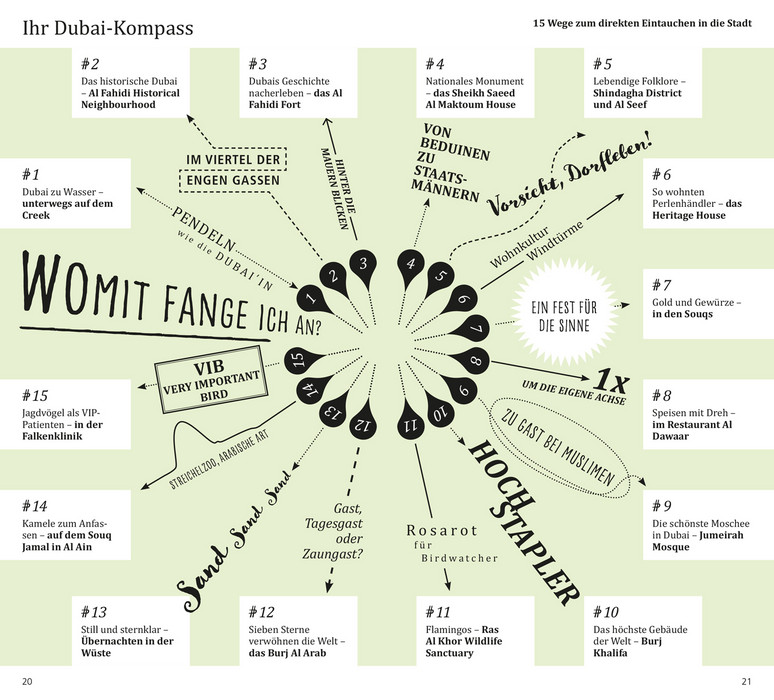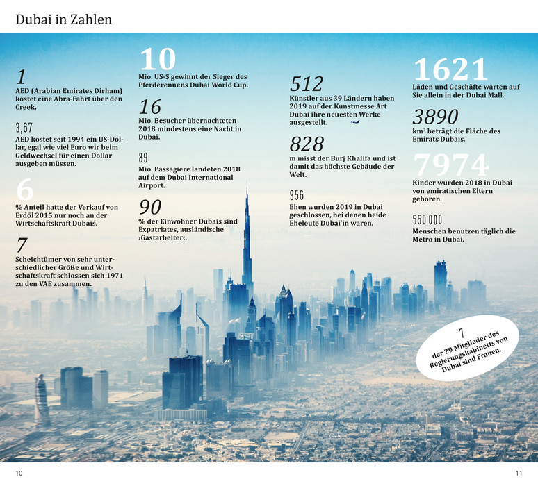 Traditionelle Souks und himmelhohe Wolkenkratzer, prächtige Moscheen und noch prächtigere Luxushotels gehören für die Dubai’in, die Einwohner des Emirats, so selbstverständlich zu ihrer Welt wie Kamele, Gewürze, Ramadan und die Wüste. Mit den 15 »Direkt-Kapiteln« des Reiseführers von Gerhard Heck können Sie sich zwanglos unter die Dubai’in mischen, direkt in das Stadtleben eintauchen und die Highlights und Hotspots kennenlernen: alte Heritage Houses und spannende Museen, das Al Fahidi Fort und den Palast der Herrscherfamilie Al Maktoum, ein Drehrestaurant mit Panoramablick, eine Flamingo-Kolonie oder eine Falkenklinik. In eigenen Kapiteln erfahren Sie, wo es sich in fremden Betten gut schläft, wo Sie glücklich satt werden, wohin die Dubai’in zum Stöbern und Entdecken gehen und wohin es sie zieht, wenn die Nacht beginnt. Mit den Übersichtskarten, genauen Stadtteilplänen und dem separaten großen Cityplan können Sie sich nach Lust und Laune durch die Stadt treiben lassen.