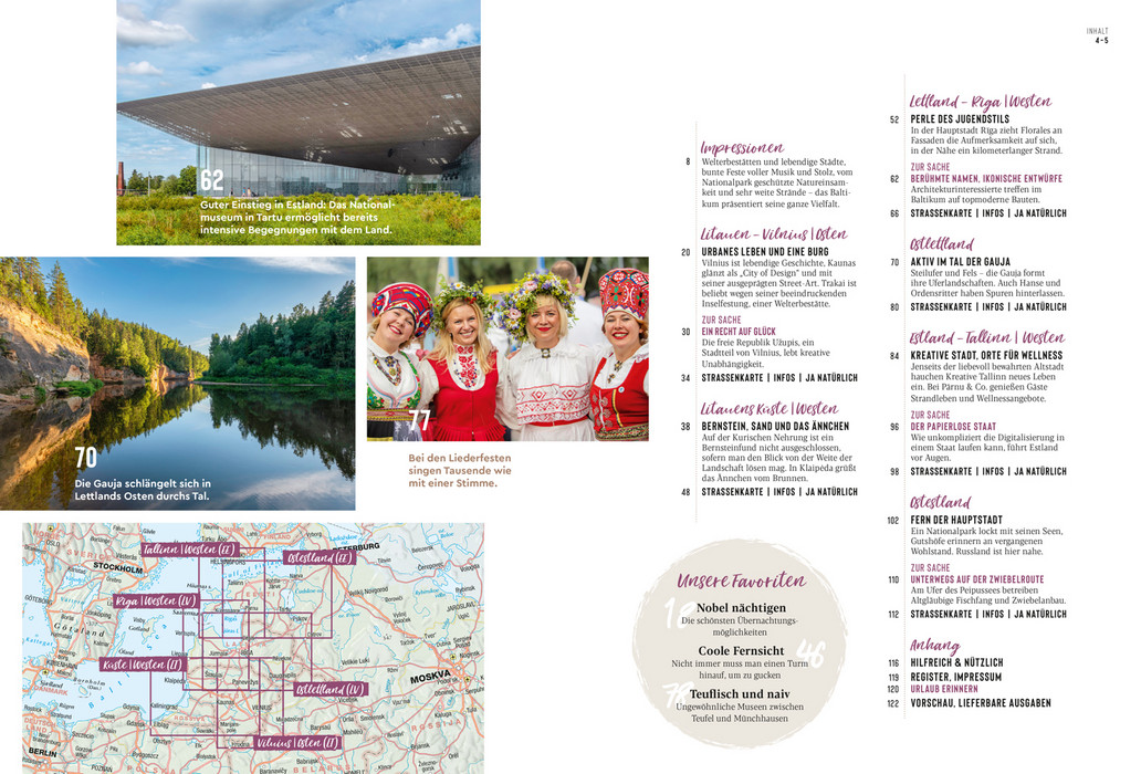 Die baltischen Staaten im Nordosten Europas sind an Vielfalt kaum zu überbieten. Ein Urlaub reicht kaum aus, um alles zu entdecken: Kulturinteressierte kommen im mittelalterlichen Juwel Tallinn, in Vilnius, dem „Rom des Nordens“, oder in Riga mit seinen prächtigen Jugendstilbauten auf ihre Kosten. Wer Ruhe und Abgeschiedenheit sucht, findet sie im Gauja-Nationalpark oder an den unberührten Stränden der Ostsee: Der DuMont Bildatlas zeigt Ihnen, wo die eindrucksvollsten Erlebnisse auf Sie warten.