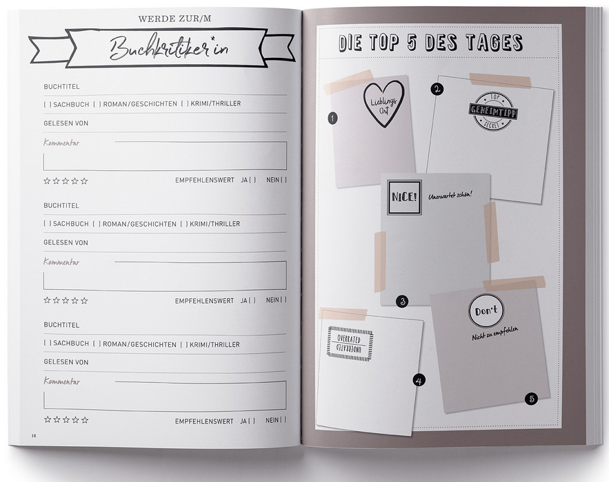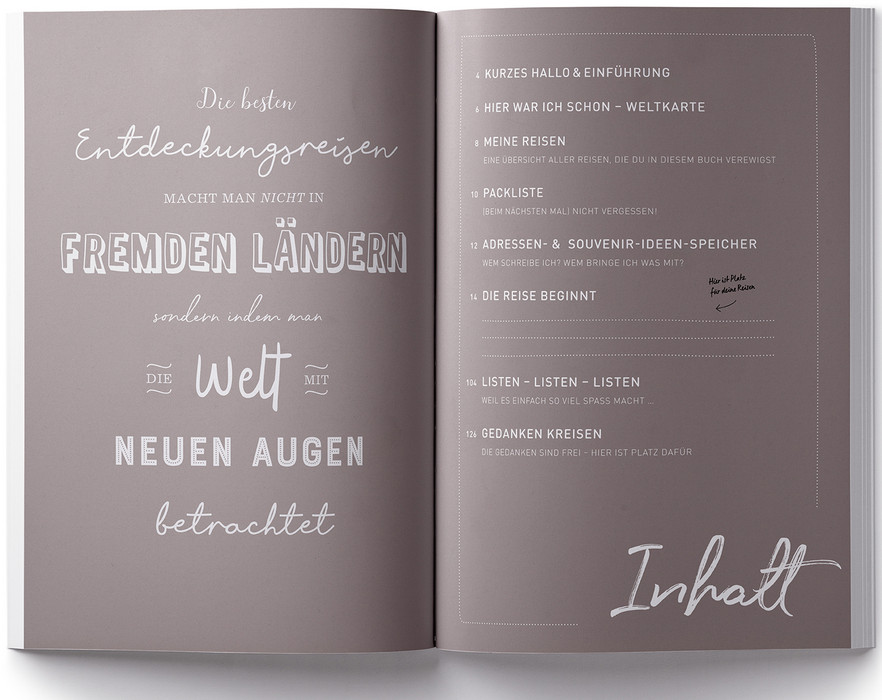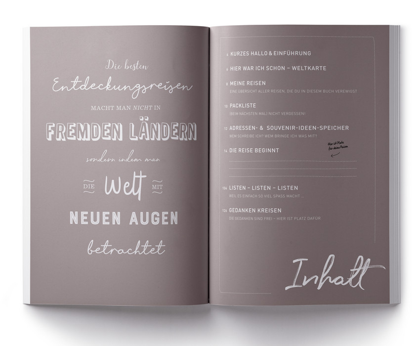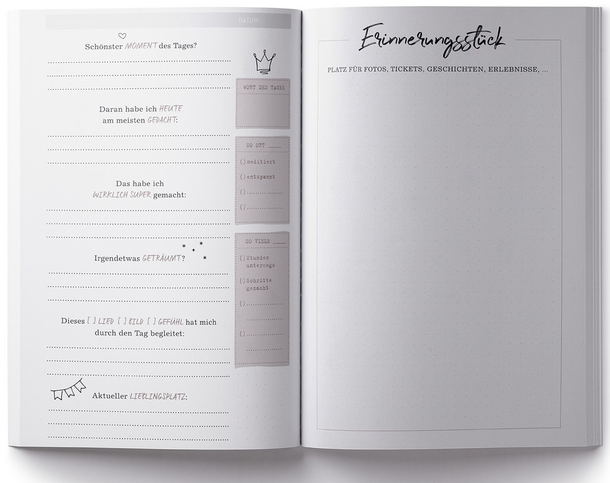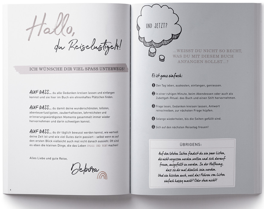 Die 128 Seiten bieten zudem viel Platz um Geschichten, Fotos oder Erinnerungsstücke festzuhalten und einzukleben. Zusätzliche inspirierende & praktische Listen, sowie freie Seiten lassen dabei keine Details vergessen.