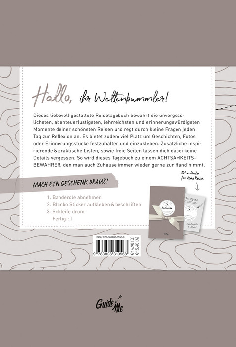 Dieses liebevoll gestaltete Erinnerungsbuch hält die unvergesslichsten, abenteuerlustigsten, lehrreichsten und erinnerungswürdigste Momente unserer schönsten Reisen fest und regt durch kleine Fragen jeden Tag zur Reflexion an. So wird das Reisetagebuch zu einem Achtsamkeits-Bewahrer, den man auch Zuhause immer wieder gerne zur Hand nimmt.