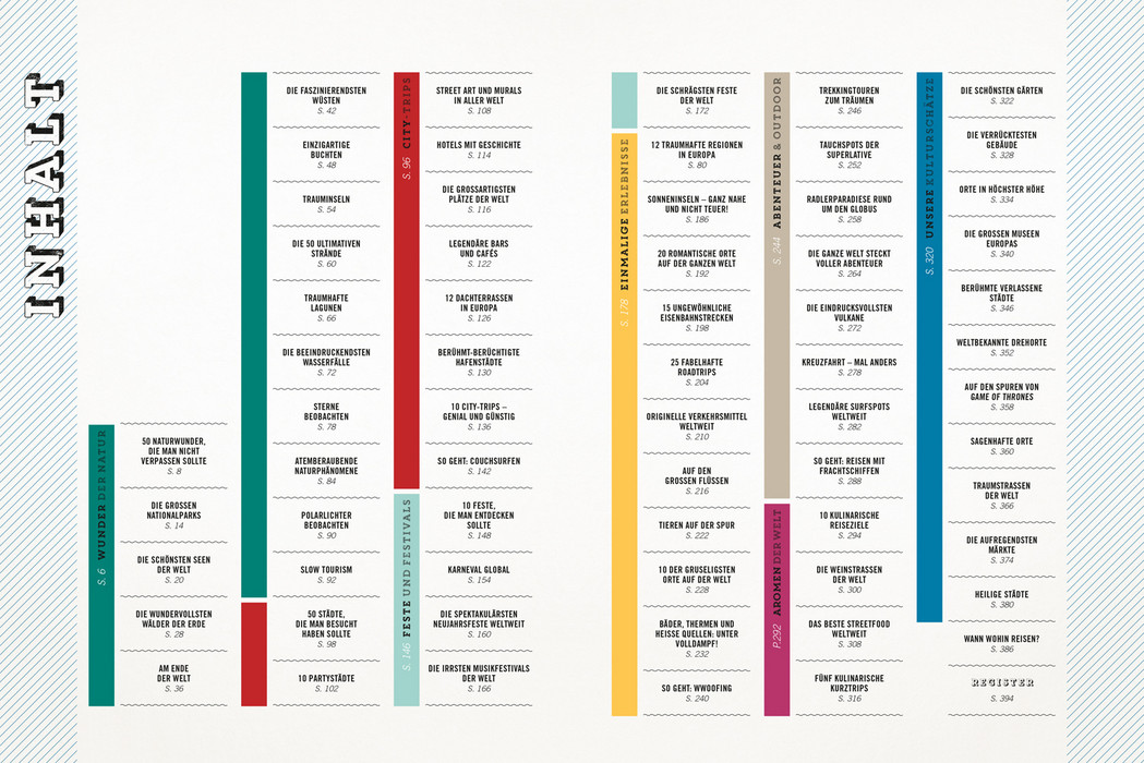 ist zurück – mit mehr Seiten, fünf ganz neuen Kapiteln, aktuellen Tips zu den bestehenden Zielen und noch mehr Reiseideen von ganz verrückt bis ganz berühmt! Auf 400 individuell gestalteten Seiten entführt der Prachtband an Orte voller Geheimnisse und Magie, auf Feste zum Mitfeiern und Staunen, in die Metropolen der Welt und in die unbekanntesten Winkel, zu den weltberühmten Sights und zu den erstaunlichsten Naturwundern unseres Planeten. Ein Buch wie ein kleiner Kosmos – zum Blättern, Schmökern und Sich Wegträumen.