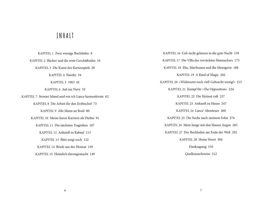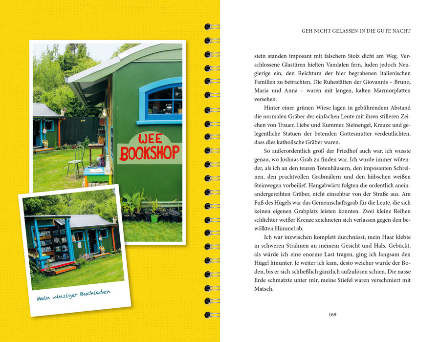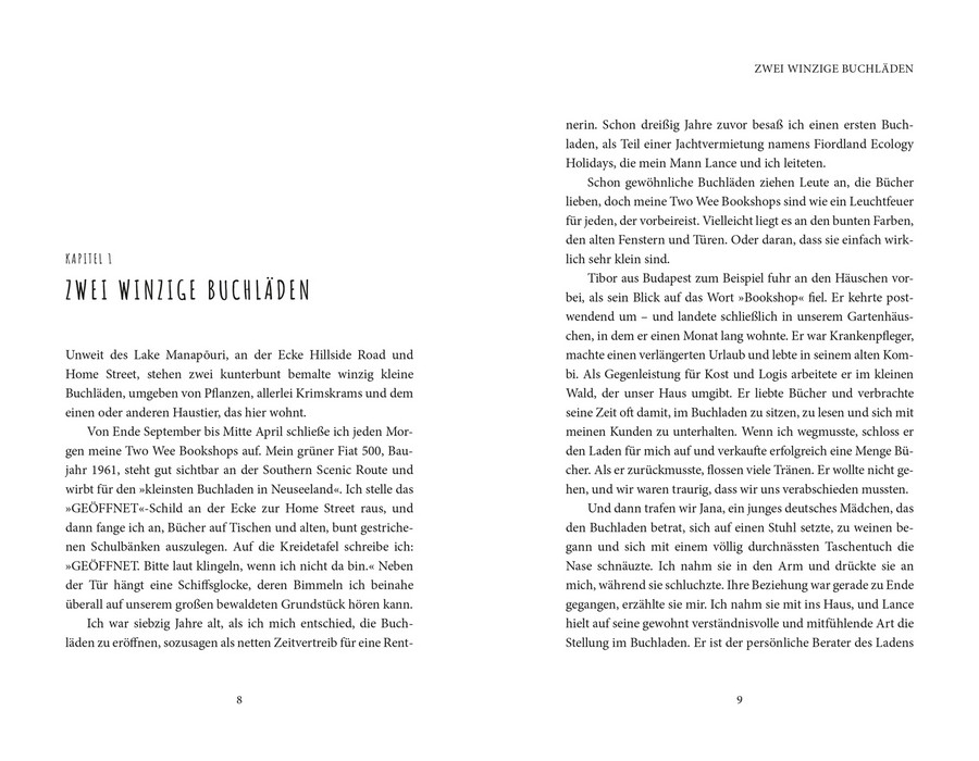 steht ein winzig kleiner Buchladen. Er gehört einer Frau mit einer unfassbaren Lebensgeschichte: Ruth Shaw verlor ihr Kind und ihre große Liebe. Sie segelte jahrelang über den Pazifik, wurde von Piraten überfallen, wegen Glücksspiels verhaftet, war Streetworkerin und Köchin für einen Erzbischof. Heute verkauft sie Bücher im abgelegenen Fiordland. Oder verschenkt sie. In ihren Memoiren verwebt sie Anekdoten über die Menschen, die ihren Buchladen besuchen, mit den bittersüßen Geschichten aus ihrem abenteuerlichen Leben. Ein Buch über Trauer und Verlust, aber auch über die Liebe – zum Leben, zur Welt der Bücher und zur Weite des Ozeans.