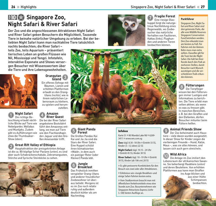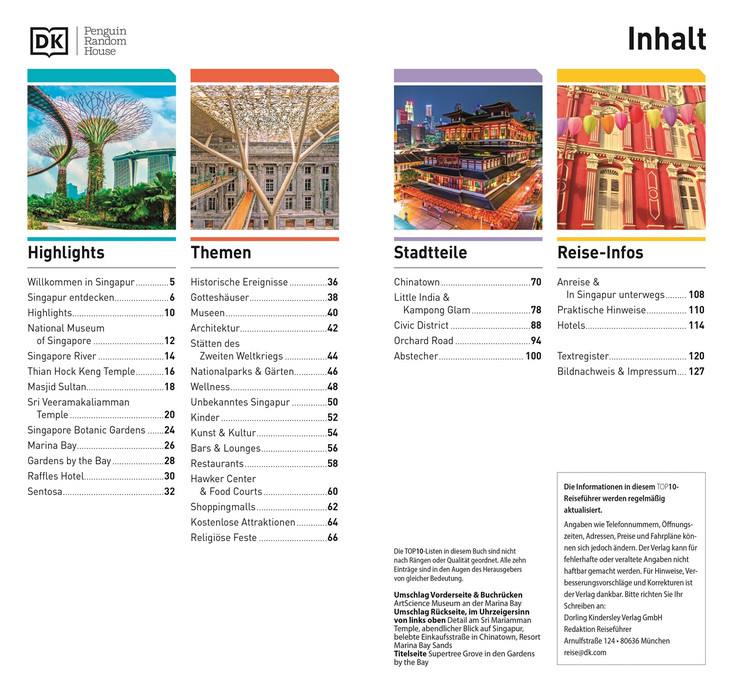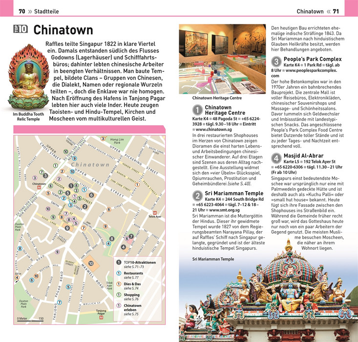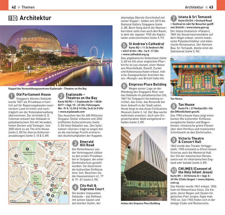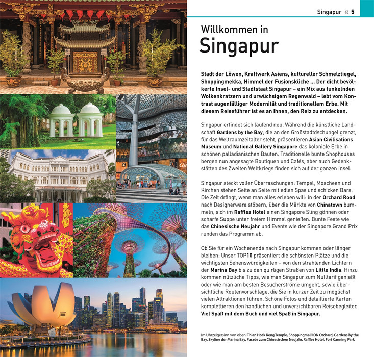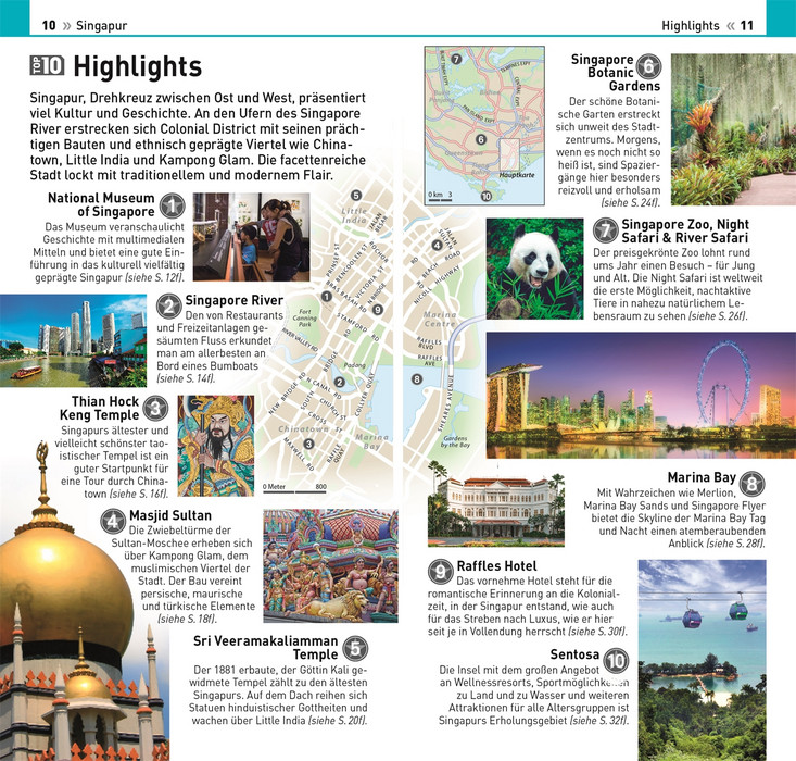 Die 10 beeindruckendsten Tempel, die 10 besten Wellness-Oasen, die 10 leckersten Food Courts: präsentiert der alle wichtigen Sehenswürdigkeiten, Orte und Aktivitäten in der „Löwenstadt“ Singapur. Dank der – gegliedert nach Highlights, Themen und Stadtteilen – können Sie einfach und bequem Ihre ganz für den nächsten Singapur-Urlaub planen und umsetzen. Das passt in jede Hand- und Hemdtasche – ideal zum Mitnehmen! Kraftwerk Asiens, kultureller Schmelztiegel, Shoppingmekka, Himmel der Fusionsküche: Der dicht bevölkerte Insel- und Stadtstaat Singapur lebt vom Kontrast augenfälliger Modernität und traditionellem Erbe. Entdecken Sie den Mix aus funkelnden Wolkenkratzern und urwüchsigem Regenwald – Im bewährten TOP10-Prinzip werden die beliebtesten Sightseeing-Orte und Unternehmungen in Singapur kurz und knackig aufbereitet. Der kompakte Stadtführer ist der optimale Begleiter auf Ihrer Städtereise nach Singapur – angenehm leicht, aber randvoll mit Infos und Tipps! Neben den detaillierten Stadtteil-Karten und Touren im Reiseführer enthält der handliche City Guide zusätzlich eine wasserfeste Karte mit Stadtplan zum Herausnehmen. Von Singapurs ältestem taoistischen Tempel Thian Hock Keng und der Moschee Masjid Sultan über die Marina Bay mit Wahrzeichen wie Merlion, Marina Bay Sands und Singapore Flyer bis zu Singapurs Erholungsgebiet Sentosa Island: Alle, die wenig Zeit auf ihrer Reise haben, führt der Reiseführer auf direktem Weg zu den der Stadt Singapur. Jede der TOP10-Attraktionen wird mit näher vorgestellt. Sie verbringen nur 2 oder 4 Tage in Singapur? Oder Sie legen einen Zwischenstopp auf Ihrer Malaysia-Reise ein? Kein Problem! Damit Sie die Zeit in Ihrem Kurzurlaub bestmöglich nutzen können, bietet Ihnen der TOP10 Reiseführer Inspirationen und , die Sie zu den bekanntesten Sehenswürdigkeiten und an interessante Orte führen. Besonders praktisch: Alle Touren sind auf einer Karte bereits eingezeichnet, sodass Sie die Stadt bequem zu Fuß oder mit öffentlichen Verkehrsmitteln erkunden können. Schlendern Sie entlang der historischen Godowns und Schifffahrtsbüros durch Chinatown, tauchen Sie ein in die belebte Shoppingmeile Orchard Road oder machen Sie einen Abstecher in die Wildlife Reservate in der Umgebung – im TOP10 Singapur-Reiseführer werden die einzelnen Stadtteile und Ausflüge ins Umland übersichtlich und ausführlich porträtiert. zeigen berühmte Sehenswürdigkeiten, charmante Stadtviertel sowie Restaurant-, Shopping- oder Tourenvorschläge auf einen Blick. Singapur mit Kindern, Shoppen in Singapur oder Singapur abseits der Touristenwege? Die bieten eine ideale Grundlage für Ihre ganz persönliche Reiseplanung. Ob Bars und Food Courts, Architektur und Kunst oder kostenlose und unbekannte Attraktionen: Im TOP10 Reiseführer Singapur finden Sie genau das Richtige für Ihr individuelles Stadtabenteuer – als Alleinreisende*r, als Paar oder als Familie. Damit Sie sich in Singapur schnell orientieren können, ist der TOP10 Reiseführer mit einer ausgestattet. Wertvolle zu Anreise, Verkehrsmitteln, Sicherheit und Gesundheit sowie Geld und Kommunikation ermöglichen es Ihnen, sich bestens auf Ihre Reise vorzubereiten und vor Ort problemlos zurechtzukommen. Mit diesem Singapur-Reiseführer machen Sie sich das Leben im Urlaub leicht!