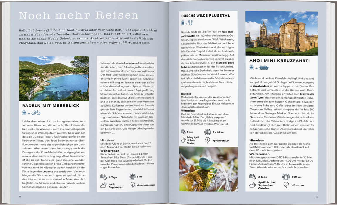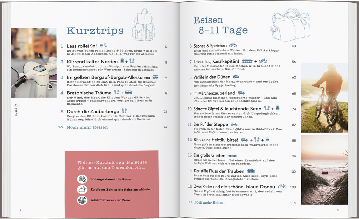 EUROPA UNGEWÖHNLICH ERLEBEN, nachhaltig und ganz ohne Flug? Wie wäre es zum Beispiel mit Inselhüpfen per Fähre in Griechenland? Radelnd das romantische Cornwall erkunden? Oder mit einen Motorroller-Kurztrip durch hübsche Kleinstädte in Belgien düsen? Dieses Buch nimmt mit auf 30 spannende und einzigartige Trips quer durch Europa, die man so in keinem Reisebüro buchen, aber ganz mühelos nachreisen kann. Praktische Tipps zur fluglosen An- und Abreise, Schritt-für-Schritt-Beschreibung der Route sowie Vorschläge für Aktivitäten vor Ort machen die Planung leicht. Für noch mehr Inspiration sorgen im Kapitel „Mehr davon“ rund 20 weitere Ideen für umweltfreundlichen Urlaub ‒ und zahlreiche tolle Fotos, die schon beim Durchblättern die Abenteuerlust wecken.