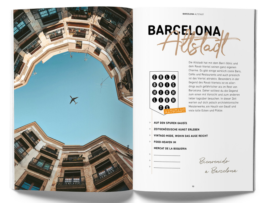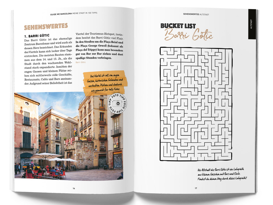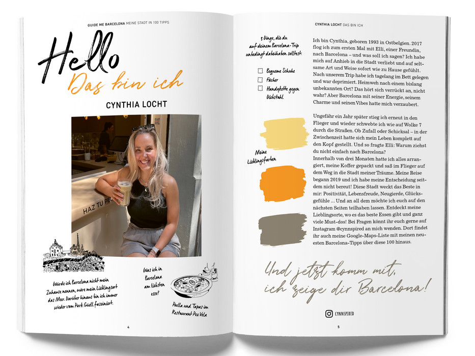 Der Reiseführer einer neuen Generation mit 100 kompakten Tipps. Die Travel-Bloggerin Cynthia Locht zeigt dir ihre Lieblingsstadt Barcelona, und verrät an welcher Ecke man den perfekten Schnappschuss macht oder wo die Tapas am besten schmecken! Gepaart mit den typischen Must-See-Sights erlebst du Barcelona mit diesem Reiseführer einmal ganz anders. Und eins ist garantiert: Dein Instagram-Feed wird heißlaufen! Im modernen Design, mit individuellen Illustrationen und freien Kreativ-Seiten ist der GuideMe Reiseführer Barcelona dabei auch ein echter Hingucker und stylischer Begleiter.
