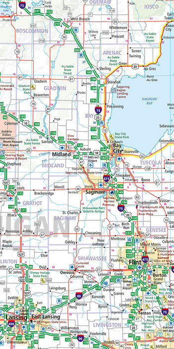 Die thematische Karte enthält detaillierte Informationen über Ortschaften und das verbindende Strassennetz. Reisende mit Auto oder Motorrad finden dank den gut erkennbaren, übersichtlich dargestellten Autobahnen, Autostrassen, Hauptverkehrsstrassen, Landstrassen und Nebenstrassen immer den richtigen Weg.