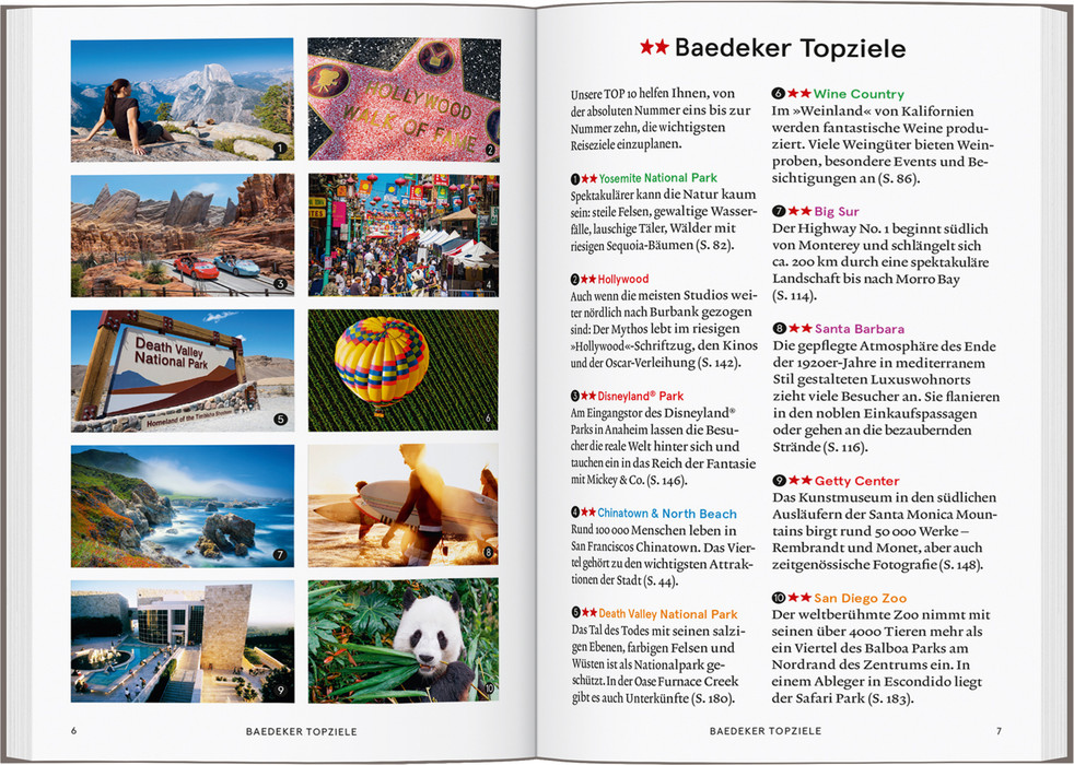 Als wenn er genau wüsste, was Ihnen gefällt – planen Sie morgens schnell und einfach den Tag mit dem Baedeker SMART Kalifornien Reiseführer. Besuchen Sie an einem Tag Los Angeles und Umgebung. In Hollywood können Sie sich für einen Moment wie die ganz großen Stars der Kinoleinwand fühlen und anschließend im Disneyland-Park Ihre Kindheitshelden treffen. Oder wie wäre es mit einem Abstecher nach San Diego im Süden von Kalifornien? Hier können Sie die einzigartige Wüstenstadt Palm Springs entdecken. Bei einem Trip entlang der Zentralküste sollten Sie keinesfalls die Orte Santa Barbara und Santa Cruz verpassen. Neben allen klassischen Reisezielen halten wir Reisetipps für ganz besondere Urlaubsmomente für Sie bereit. Folgen Sie beispielsweise den Spuren der Goldsucher in den Gold-Städten Sacramento und Gold Country – nicht umsonst wird Kalifornien auch „Golden State“ genannt. Mit unseren inspirierenden Ideen sorgen wir für eine entspannte Urlaubsplanung und machen Ihren Urlaub in Kalifornien unvergesslich.