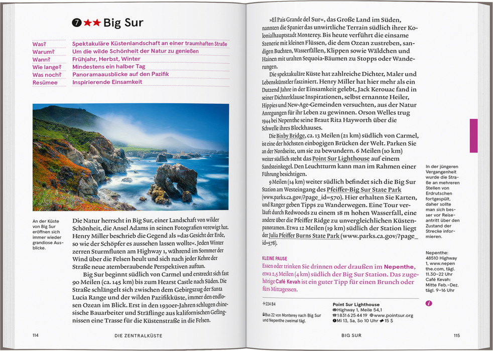 • Tipps für genussvolle »kleine Pausen« in Cafés, Restaurants oder Bars und »magische Momente« in Kalifornien