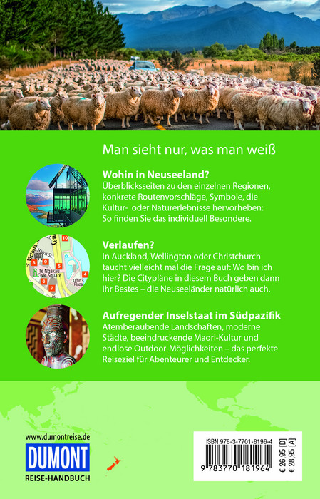 Mit dem DUMONT Reise-Handbuch Neuseeland auf Entdeckungstour im Land der Kiwis Eine Reise nach Neuseeland ist wie ein Best-of der Kontinente: Grüne Regenwälder finden sich hier neben rauen Berglandschaften. Nebelverhangene Fjorde wechseln sich ab mit trockenen Steppen und goldenen Palmenstränden. Genauso vielfältig wie die Natur sind auch die Möglichkeiten, sie zu genießen. Ob entspannter Strandurlaub, Rucksacktour zwischen den großen Städten oder Bergwandern extrem: Mit dem DUMONT Reise-Handbuch sehen Sie mehr von Land und Leuten und lernen Neuseeland individuell und authentisch kennen.