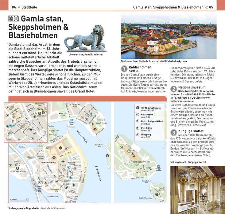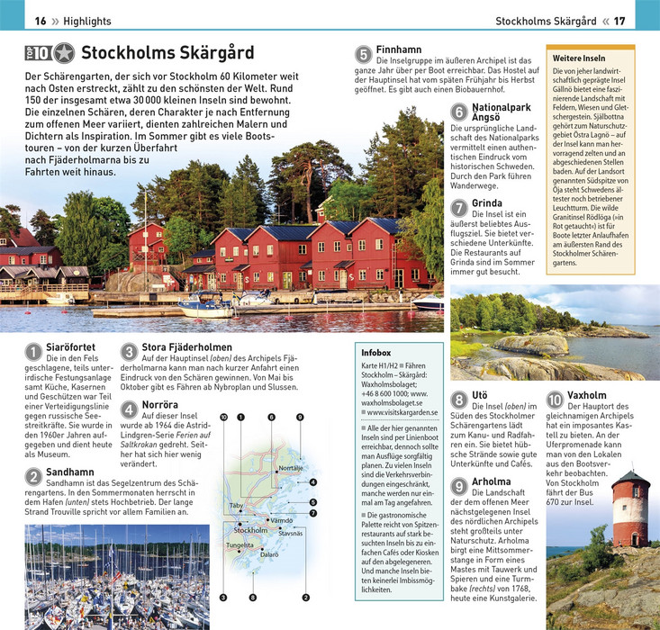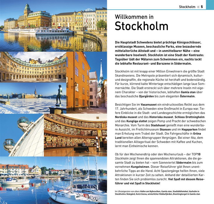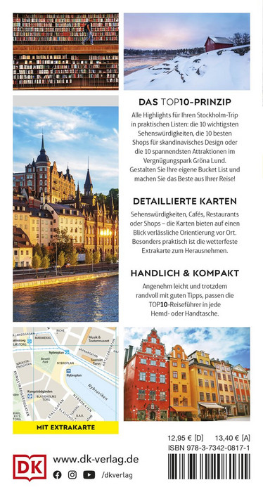 Die 10 schönsten Inseln des Schärengartens, die 10 bedeutendsten Museen in Stockholm, die 10 besten Läden für Skandinavisches Design: präsentiert der alle wichtigen Sehenswürdigkeiten, Orte und Aktivitäten in der größten Stadt Skandinaviens Stockholm. Dank der – gegliedert nach Highlights, Themen und Stadtteilen – können Sie einfach und bequem Ihre ganz für den nächsten Stockholm-Urlaub planen und umsetzen. Das passt in jede Hand- und Hemdtasche – ideal zum Mitnehmen! Königliche Paläste und grüne Parks, lebhafte Altstadtstraßen und die Weite des Schärenarchipels, exzellente Museen und ein reges Nachtleben: Tauchen Sie ein in das facettenreiche Leben von Schwedens Hauptstadt – Im bewährten TOP10-Prinzip werden die beliebtesten Sightseeing-Orte und Unternehmungen in Stockholm kurz und knackig aufbereitet. Der kompakte Stadtführer ist der optimale Begleiter auf Ihrer Städtereise nach Stockholm – angenehm leicht, aber randvoll mit Infos und Tipps! Neben den detaillierten Stadtteil-Karten und Touren im Reiseführer enthält der handliche City Guide zusätzlich eine wasserfeste Karte mit Stadtplan zum Herausnehmen Vom Gröna Lund über die grüne Oase Hagaparken und Schloss Drottningholm bis zu Stockholms Skärgård. Dieser Reiseführer führt auf direktem Weg zu den der Stadt Stockholm. Jede der TOP10-Attraktionen wird mit näher vorgestellt. Sie verbringen nur ein Wochenende in Stockholm? Kein Problem! Damit Sie die Zeit in Ihrem Kurzurlaub bestmöglich nutzen können, bietet Ihnen der TOP10 Reiseführer Inspirationen und , die Sie zu den bekanntesten Sehenswürdigkeiten und an interessante Orte entführen. Besonders praktisch: Alle Touren sind auf einer Karte bereits eingezeichnet, sodass Sie die Stadt bequem zu Fuß oder mit öffentlichen Verkehrsmitteln erkunden können. Norrmalm & City, Kungsholmen & Vasastan, Gamla stan, Skeppsholmen & Blasieholmen – im TOP Stockholm-Reiseführer werden die übersichtlich und ausführlich porträtiert. zeigen berühmte Sehenswürdigkeiten, charmante Stadtviertel sowie Restaurant-, Shopping- oder Tourenvorschläge auf einen Blick. Stockholm mit Kindern, Shopping in Stockholm oder Stockholm abseits der Touristenwege? Die bieten eine ideale Grundlage für Ihre ganz persönliche Reiseplanung. Ob Kirchen und Museen, Kneipen und Bars oder kostenlose und unbekannte Attraktionen: Im TOP Reiseführer Stockholm finden Sie genau das Richtige für Ihr individuelles Stadtabenteuer – als Alleinreisende*r, als Paar oder als Familie. Damit Sie sich in Stockholm schnell orientieren können, ist der TOP10 Reiseführer mit einer ausgestattet. Wertvolle zu Anreise, Verkehrsmitteln, Sicherheit und Gesundheit sowie Geld und Kommunikation ermöglichen es Ihnen, sich bestens auf Ihre Reise vorzubereiten und vor Ort problemlos zurechtzukommen. Mit diesem Stockholm-Reiseführer machen Sie sich das Leben im Urlaub leicht!