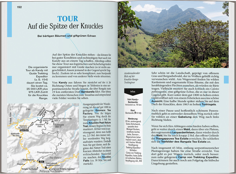 Teatime mit Blick auf Teeplantagen oder Sundowner am Strand? Oder bei einer Safari auf Elefantenpirsch gehen? Sri Lanka ist mit seiner landschaftlichen und kulturellen Fülle wahrlich eine tropische Verheißung. Lange bevor die Touristen kamen, bezauberte die Insel im Indischen Ozean mit ihren üppig grünen Naturschönheiten und weltberühmten Gewürzen schon arabische Seefahrer und europäische Kolonialherren. Heute können Sie an einem der vielen Stauseen eine bunte Vogelschar sichten, sich mit Affenhorden zwischen alten Ruinen herumtreiben und in den von Kokospalmen gesäumten Buchten Fischern begegnen, deren Familien hier seit Generationen leben. In den antiken Königsstädten und bunten Tempeln zeigt sich die kulturelle Identität der Sri-Lanker besonders intensiv. Nur zu gerne verrät Ihnen der Landeskenner und Autor Martin Petrich seine ganz persönlichen Lieblingsorte und Lieblingstouren. Die Wanderung auf den Adam’s Peak etwa wird ebenso unvergesslich bleiben wie diejenige zum Adisham Monastery.