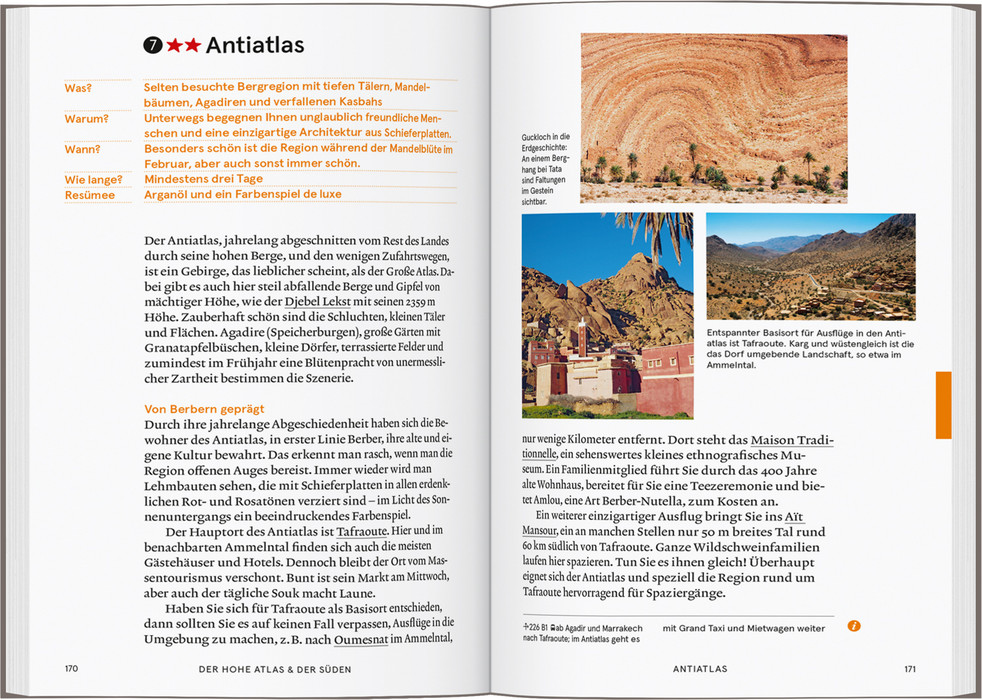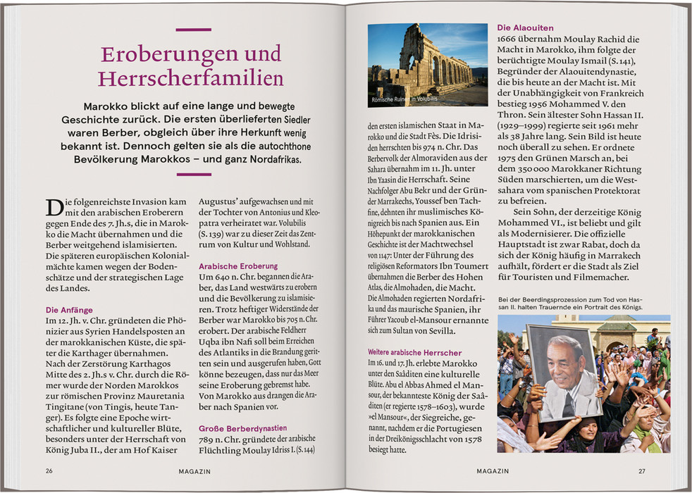 - Spannende Hintergrundinfos zur Geschichte von Marokko und den Sehenswürdigkeiten, zu Landschaft und Klima, Wirtschaft und Kultur sowie den Menschen und deren Alltag