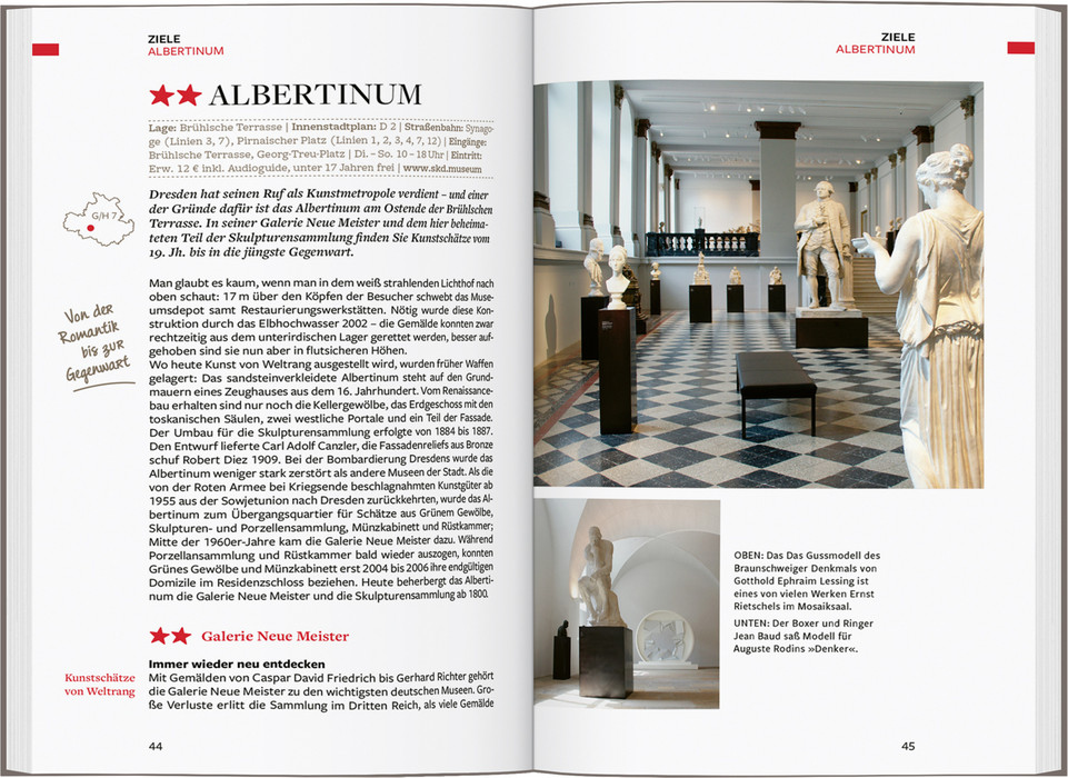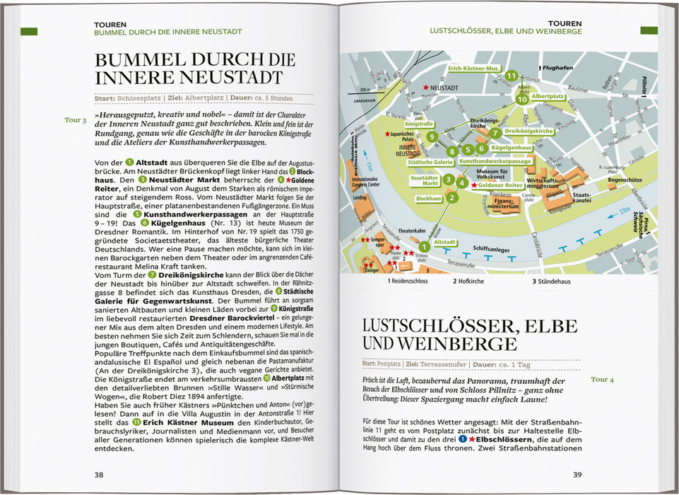 Barocke Architektur, kulturelle Vielfalt und viel Grün – wer seinen Urlaub in Dresden verbringen möchte, erlebt Natur und Großstadtflair gleichermaßen. In unserem Reiseführer Dresden zeigen wir Ihnen die Orte, die Sie auf keinen Fall verpassen sollten: Übersichtlich von A – Z begleiten wir Sie in eines der zahlreichen Museen, nehmen Sie mit in den Nationalpark Sächsische Schweiz und bringen Sie zur Adventszeit auf den Striezelmarkt in Dresden, einen der ältesten Weihnachtsmärkte der Welt. Vier inspirierende Tourenvorschläge lassen Sie Dresdens Neustadt und die Sehenswürdigkeiten in der Altstadt entdecken, führen Sie zu faszinierenden Bauwerken wie der Frauenkirche in Dresden und zeigen Ihnen die besten Ausflugsziele. Unsere Reisetipps verraten, wo Sie das Besondere entdecken, den schönsten Klängen lauschen und wie Sie auch bei einem Dresden-Kurzurlaub die Elbmetropole entspannt erleben. Unser Reiseführer Dresden ist der perfekte Begleiter für zuhause und unterwegs! Und all das in 6 Kapiteln inklusive: