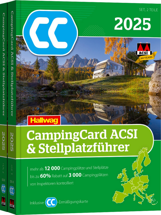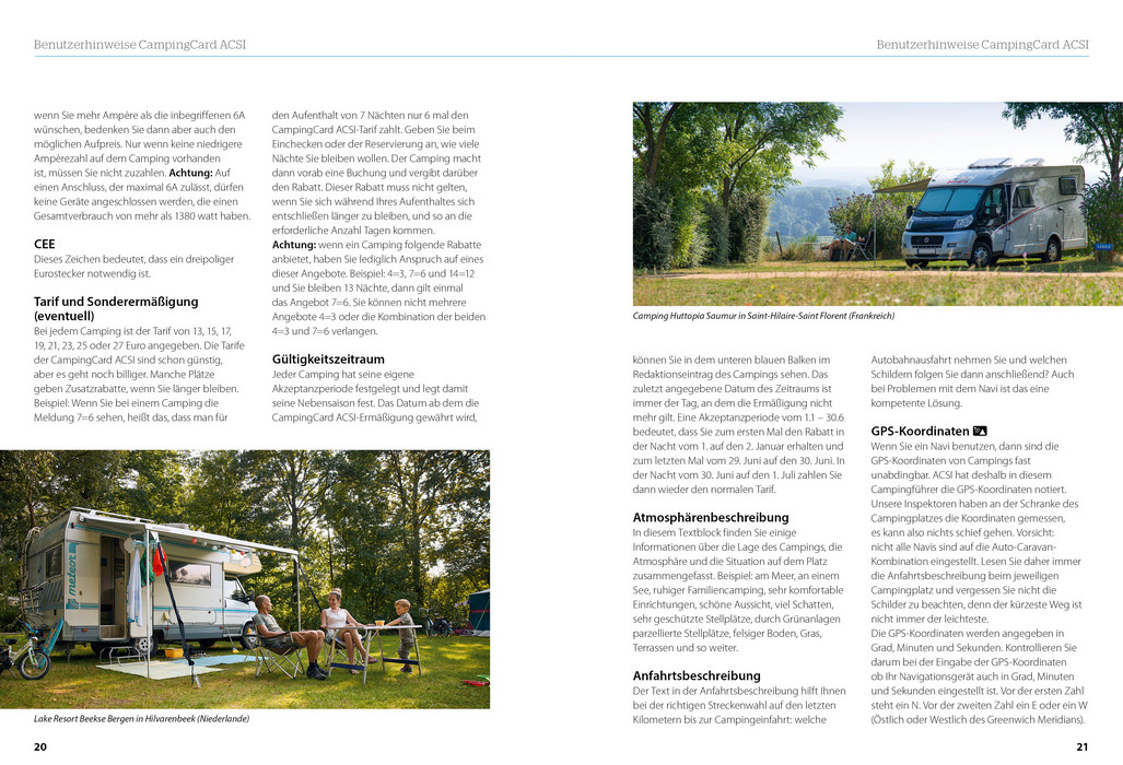 Zudem erhalten sie mit dem Campingführer die CampingCard ACSI-Ermässigungskarte. Damit zahlen Sie nie wieder zu viel für Ihre Campingaufenthalte in der Nebensaison. Auf 3000 Campingplätzen in Europa übernachten Sie während des Akzeptanzzeitraums der Ermässigungskarte zu einem festen Niedrigtarif von 15, 17, 19, 21, 23, 25 oder 27 € pro Nacht. So sparen Sie bis zu 60 % gegenüber dem normalen Übernachtungstarif!