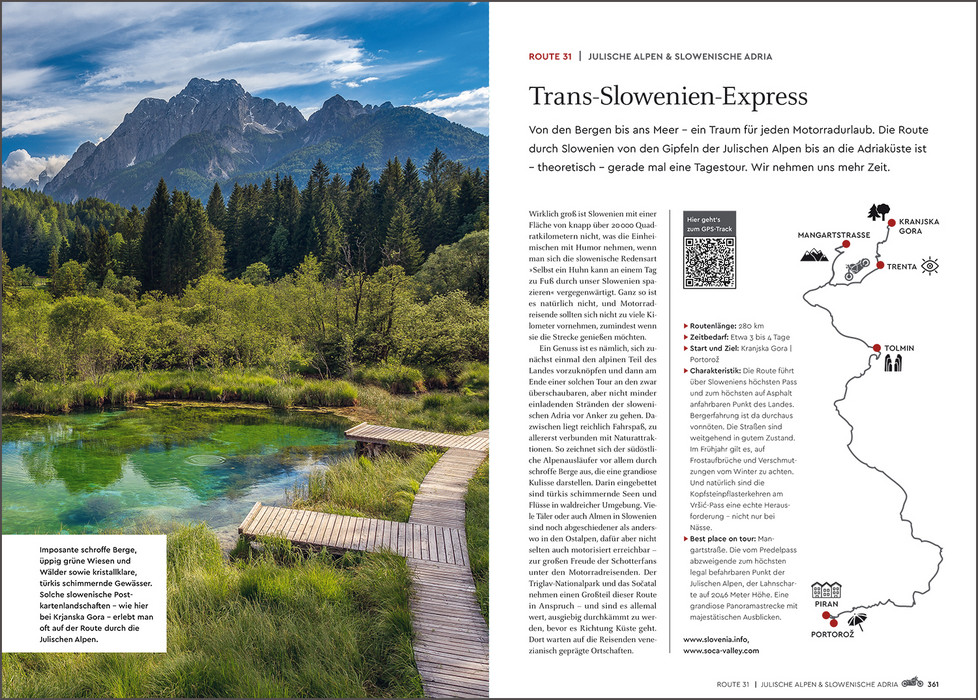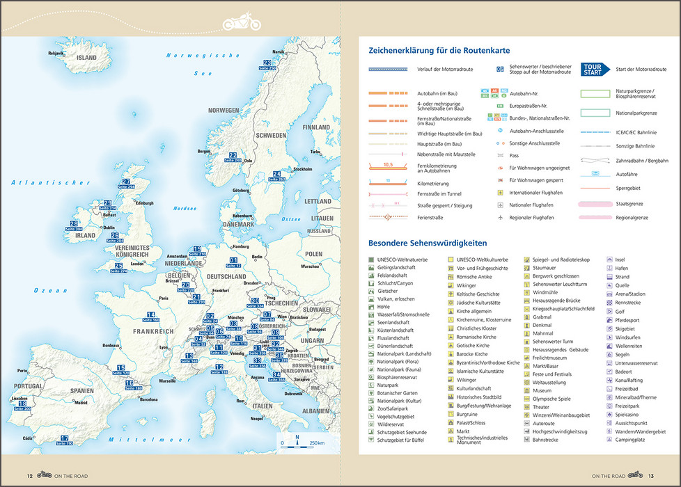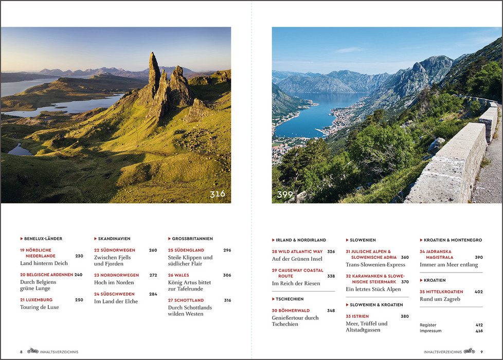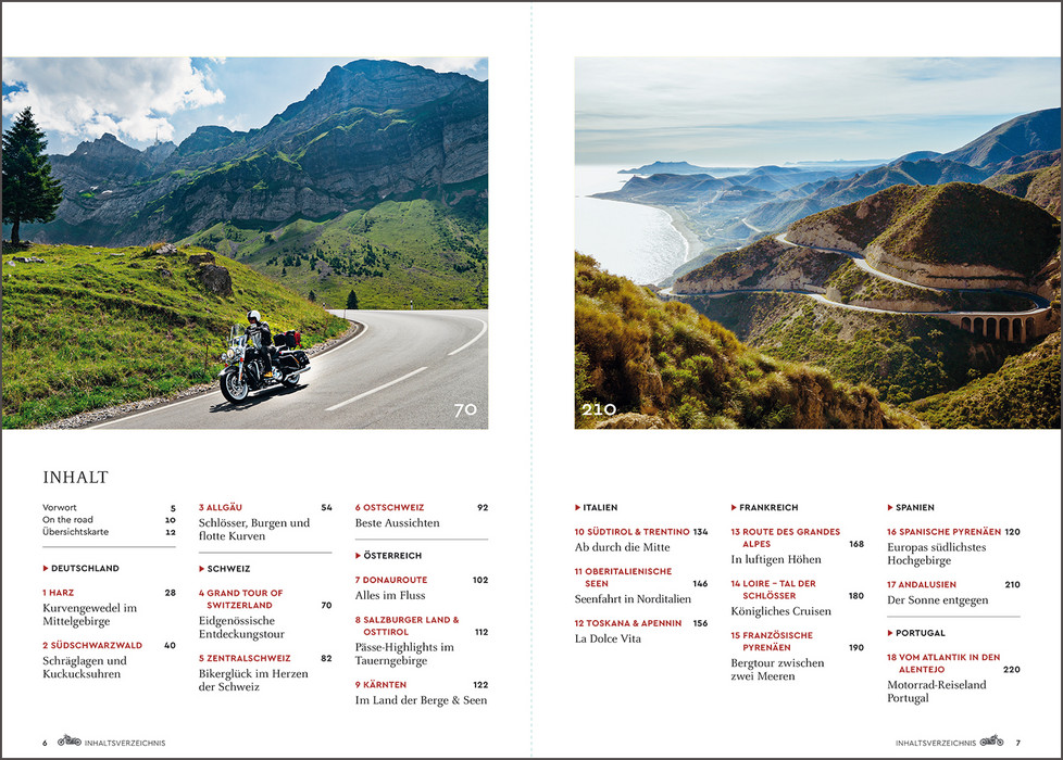 OB APPLAUSKURVEN, SERPENTINEN oder atemberaubende Panoramarouten – ganz Europa wartet nur darauf, per Motorrad erkundet zu werden. 35 Touren führen über sensationelle Passstraßen, entlang der Küstenlinien und Flussläufe und kreuzen quirlige Metropolen. Neben den legendären Routen wie die Großglockner-Hochalpenstraße oder der "Wild Atlantic Way" im Westen Irlands stehen auch einsame Strecken im hohen Norden der Lofoten auf dem Programm. Wer noch weiter hinaus will, kann gen Süden Andalusien und Portugal unsicher machen oder fährt am Mittelmeer die "Jadranska Magistrale" entlang nach Montenegro. Ausgestattet mit Kartenmaterial, GPS-Tracks sowie Übernachtungs- und Ausflugstipps kann die Reise gleich beginnen.