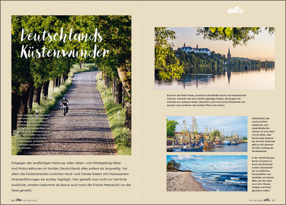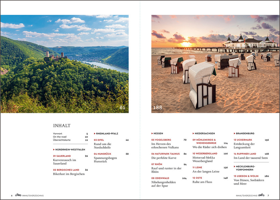 VOM MOTORRADPARADIES IM SCHWARZWALD bis zum Ostsee-Cruisen im hohen Norden – dieser Band vereint die 30 schönsten Bikertouren in Deutschland. Die ein- bis mehrtägigen Touren führen an Flussläufen entlang, über Höhenzüge wie die vom Hunsrück, Taunus und Wiehengebirge, hinein in pittoreske Städte, in den wilden Bayerischen Wald bis hin an die Grenzen von Belgien, Tschechien und Österreich. Über die Alleenstraße der Uckermark bis hinauf zu Burgen und Bergseen, stets mit im Gepäck: spektakuläre Ausblicke, Applauskurven, Panoramastrecken sowie Schnellstraßen zum Austoben. Gut gerüstet mit exakter Routenbeschreibung, Detailkarten, ausführlichem Adressteil und GPS-Tracks kann es gleich losgehen.
