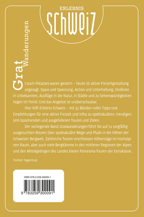 COUCH-POTATOES WAREN GESTERN – heute ist aktive Freizeitgestaltung angesagt. Ob Spaß und Spannung, Action und Unterhaltung oder Einblicke in Unbekanntes – Ausflüge in die Natur, in Städte und zu Sehenswürdigkeiten liegen im Trend. Und das Angebot ist unüberschaubar. Hier hilft Erlebnis Schweiz – mit 32 Bänden voller Tipps und Empfehlungen für eine aktive Freizeit und Infos zu spektakulären, trendigen, (ent-)spannenden und ausgefallenen Touren und Zielen. Der neue Wanderführer „Gratwanderungen“ führt Sie auf 72 sorgfältig ausgesuchten Routen über spektakuläre Wege und Pfade in die Höhen der Schweizer Bergwelt. Zahlreiche Touren erschließen Höhenzüge im hochalpinen Raum, aber auch viele Bergkämme in den mittleren Regionen der Alpen und den Mittelgebirgen des Landes bieten Panorama-Touren der Extraklasse.