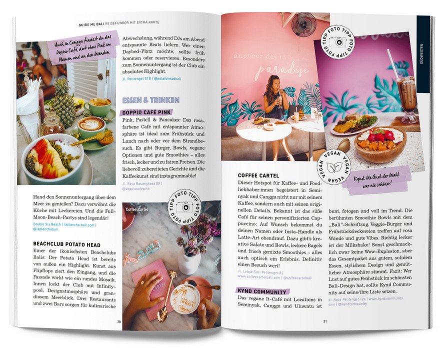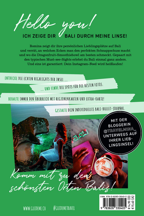 Das ikonische Himmelstor des Pura-Lempuyang-Tempels, die dunkelgrünen Reisterrassen, der Tibumana-Wasserfall … Zu diesen und weniger bekannten Spots auf Bali und den Inseln Nusa Penida, Nusa Ceningan und Nusa Lembongan führen die Fotos und Tipps von Romina Reinke, die als @travelmina_ auf Instagram unterwegs ist. Mit dem Reiseführer mit herausnehmbarer Faltkarte findet man die schönsten Strände zum Relaxen und Schnorcheln genauso wie die besten Spots für ausgelassene Partynächte. Auf Kreativseiten hältst du Fotos oder Erinnerungen zu den Highlights fest und auf freien Seiten hast du Platz, um Wichtiges rund um deinen Inseltrip Bali zu notieren. Und eins ist garantiert: Dein Instagram-Feed wird heißlaufen!