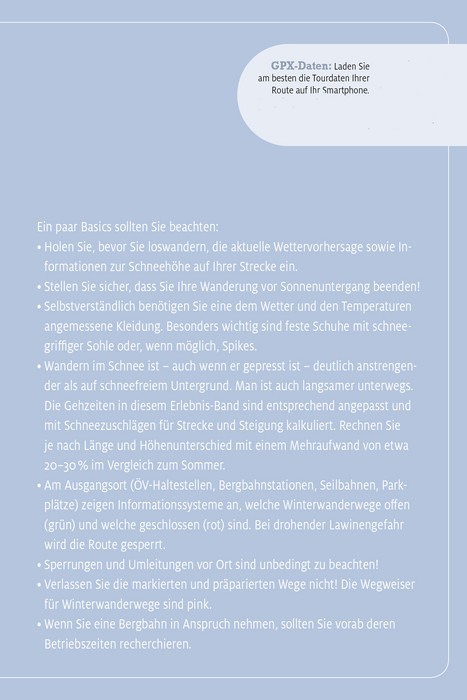 Mit den gut beschriebenen, leicht lesbaren Winterwandertouren, dem handlichen Format, den übersichtlichen Kartenausschnitten sowie den gekennzeichneten Schwierigkeitsgraden und Tourencharakteren ist dieser Freizeitführer das perfekte Hilfsmittel, um die passende Tour zu finden. Die Landschaftsbilder vermitteln zudem einen realistischen Eindruck der Wanderungen.