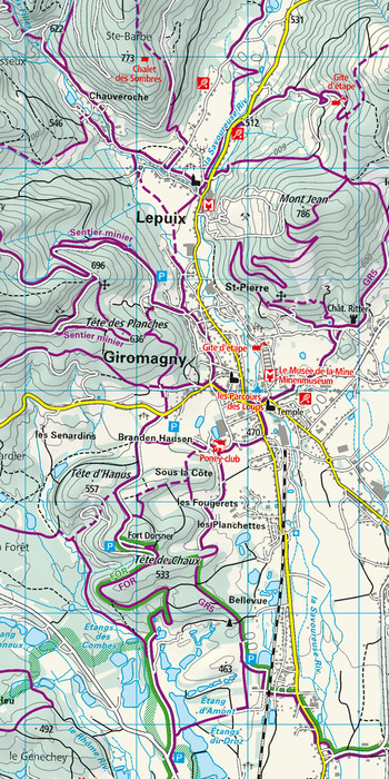 Die Karte zeigt von Guebwiller bis Belfort die wichtigsten Gebiete von Interesse und dessen Trails und Freizeitmöglichkeiten.