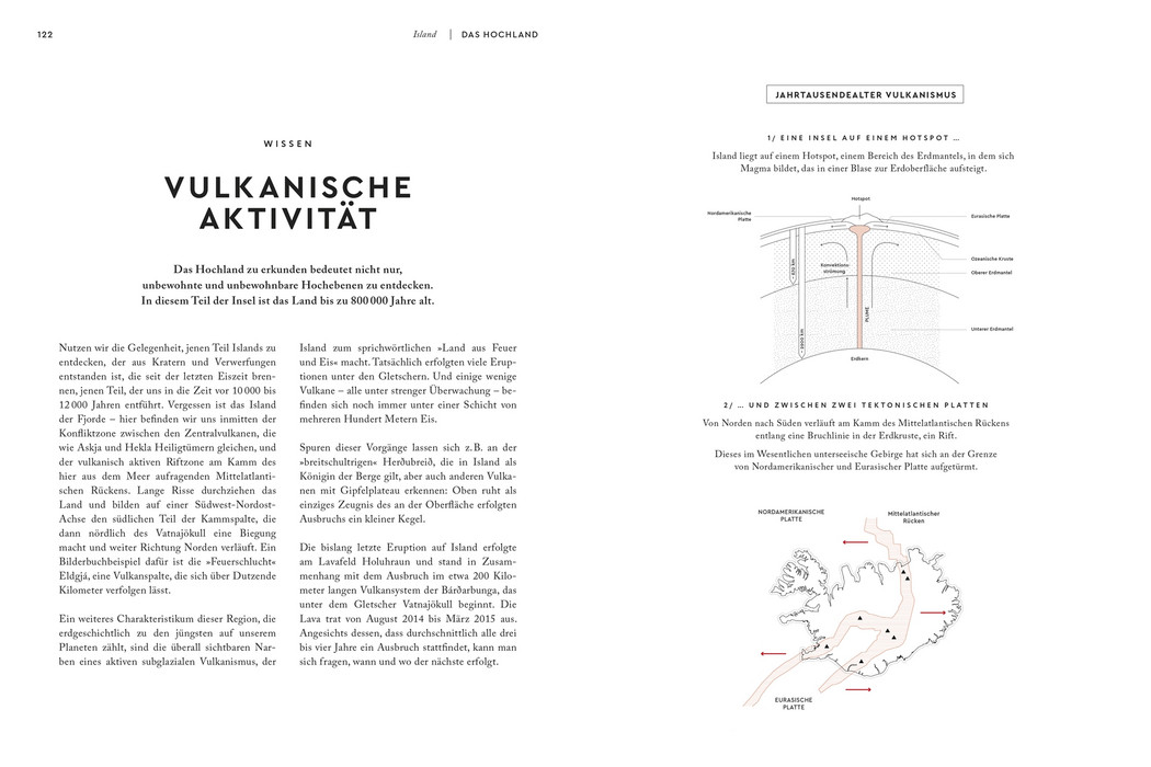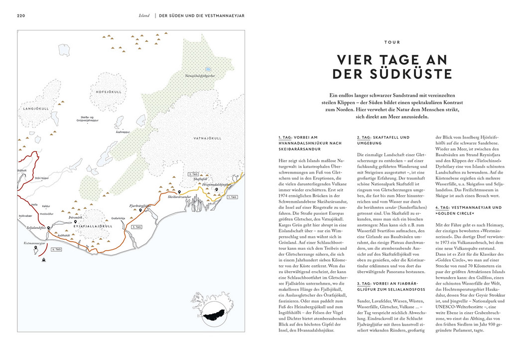 In diesem Bildband werfen über 300 kunstvolle Farbfotos einen ganz besonderen Blick auf Bekanntes und weniger Bekanntes und lassen Sie staunen angesichts der überwältigenden Naturwunder Islands. Von breiten Gletscherflüssen, schneebedeckten Kraterlandschaften und arktischen Denkmälern bis zu den tanzenden Polarlichtern Islands – die ästhetische Bildsprache macht dieses Reisebuch Island außergewöhnlich. Wild und unberührt, märchenhaft und mystisch, Island ist ein Land der Extreme. Egal ob Sie Islandpferden, Polarfüchsen oder Blauwalen begegnen, in heißen Naturquellen wie der Blauen Lagune baden, die gewaltigen Geysire Islands bestaunen, die Troll-Halbinsel Tröllaskagi besuchen, auf den Spuren isländischer Sagas wandeln oder die nördlichste Hauptstadt der Welt Reykjavík erkunden – Sie werden dieses Land nie vergessen! Von der wundervollen Seenlandschaft Mývatn mit eindrucksvollen Wasserfällen, dampfenden Geothermalfeldern, Höhlen und Kratern über die farbenfrohe Bergwelt Landmannalaugar mit den bemerkenswerten Rhyolith-Bergen und majestätischen Lavafeldern bis zur Halbinsel Snæfellsnes, die so viele verschiedene Sehenswürdigkeiten aufweist, dass sie auch „Island in Miniatur“ genannt wird. Das Land der Sagas, Islands Frauen, Die Geheimnisse der Geothermie, Islands Tier- und Pflanzenwelt, Das Leben auf dem Land, Islands Badekultur und viele weitere interessante Themen bringen Land und Menschen nahe. Porträts von Einheimischen geben tiefe persönliche Einblicke in den Alltag auf der Insel. Der energiegeladene Westen mit dem vergletscherten Vulkan Snæfellsjökull, dessen Form ein wenig an Japans Fuji erinnert. Das Land der Wildnis, Die Westfjorde, ein riesiges Plateau, in das einstige Gletscher ein wildes Durcheinander aus tiefen Fjorden gegraben haben. Der Norden, der nur noch einen Katzensprung vom Polarkreis entfernt ist. Das Hochland, die riesige Wildnis, die gänzlich unbewohnt von Menschen ist. Die Ostfjorde, mit seltsamen orangefarbenen Bergen, die über den Meereswellen aufragen. Der Süden mit dem 350 Kilometer langen schwarzen Sandstrand. Und natürlich Reykjavík, die stolze Hauptstadt des Nordens. Aufregende Routen wie Vier Tage im Hochland oder Drei Tage in Reykjavík und auf Reykjanes bieten Augenschmaus, Abenteuer und Sehenswürdigkeiten satt.