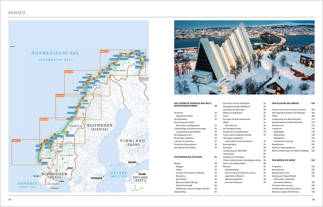 Sie gilt als »schönste Seereise der Welt«: eine Fahrt mit den Schiffen der Hurtigruten-Reederei entlang der norwegischen Westküste. Seit über 120 Jahren verkehren täglich die Postschiffe von Bergen bis Kirkenes und zurück und legen dabei in 34 Häfen an. Die Fahrt wird zu einem unvergesslichen Erlebnis aus imposanter Natur zwischen Steilfelsen und Fjorden, kombiniert mit norwegischer Gastfreundschaft.