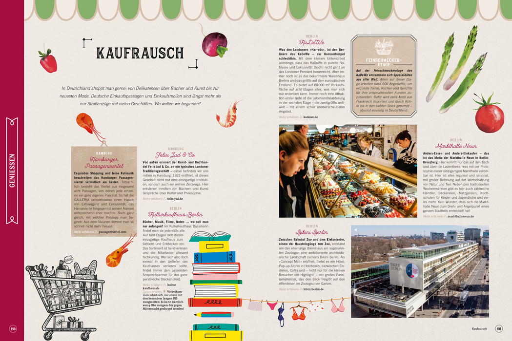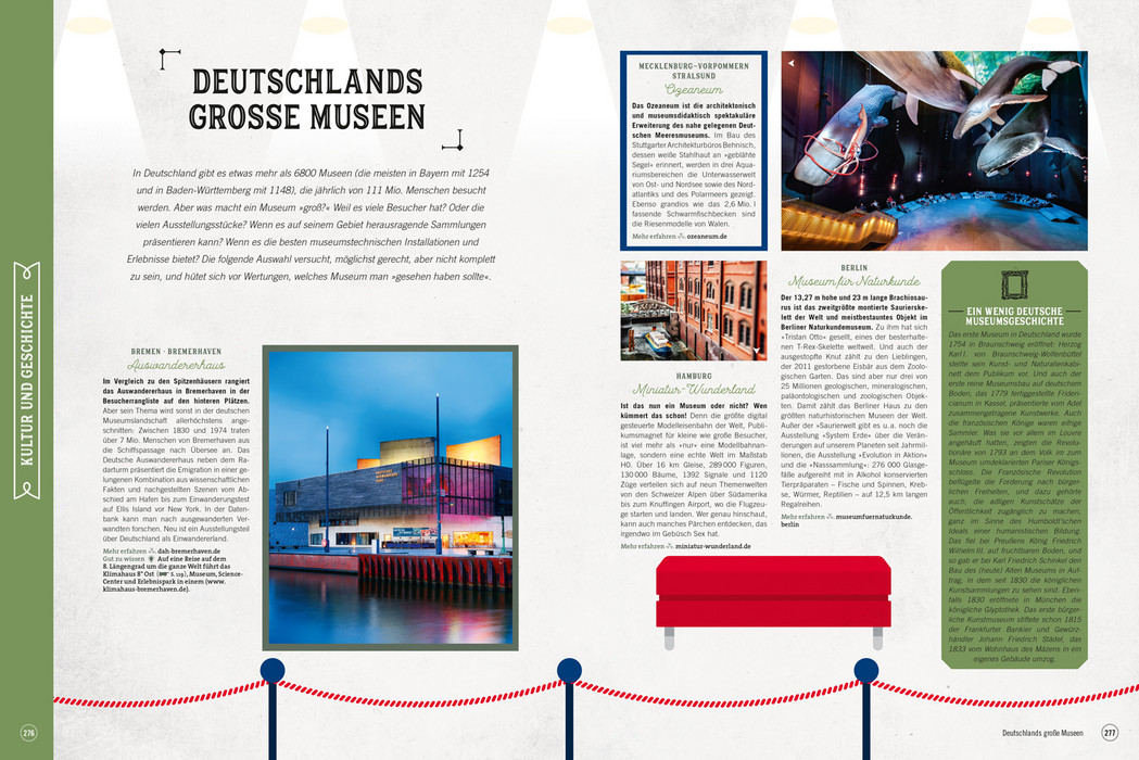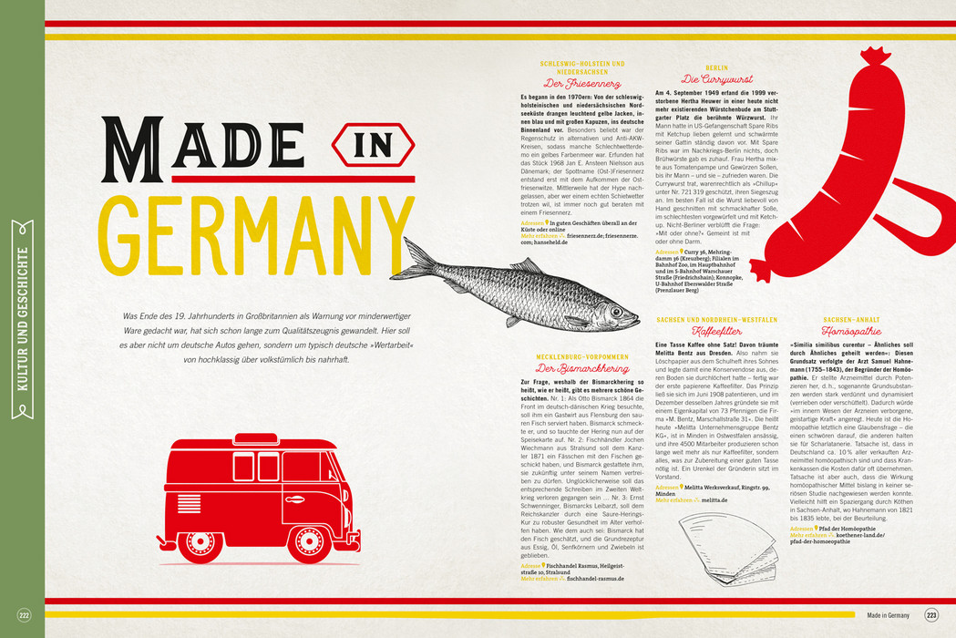 So ziemlich alles, was Deutschland attraktiv macht, ist in diesem Buch versammelt: die charmantesten Städte zwischen Flensburg und Garmisch-Partenkirchen, die schönsten Landschaften von der Ostsee bis zu den Alpen, Kultur zum Staunen und Mitmachen, liebenswerte Traditionen und vieles mehr. Egal wo es dich hinzieht - in diesem Buch findest du Anregungen für den nächsten Ausflug, für einen kurzweiligen Städtetrip oder für eine Auszeit auf dem Land. Oder einfach zu einer Sehenswürdigkeit um die Ecke, die du noch nicht kennst. Einfach reinblättern und sich überraschen lassen von der erfrischenden Kombination aus Lesevergnügen und Augenschmaus. Lust bekommen auf einen Ausflug in die eigene Heimat? Dann nichts wie los!