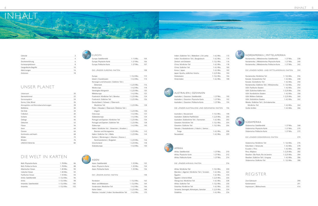 „DuMont Die Erde“ präsentiert Weltwissen. Der Weltatlas ist ein Standardwerk für alle, die ein umfassendes und anregendes Nachschlagewerk zu schätzen wissen. Am Beginn steht der Sonderteil "Unser Planet", der mit modernen Grafiken, Karten und Fotos auf 66 Seiten einen Überblick über Astronomie, Geologie und Geographie unserer Erde gibt. Auf über 200 Seiten wird dann die ganze Welt in Karten und Fakten dargestellt. Die moderne Kartografie zeigt nicht nur Höhenstufen sondern auch Ökozonen und das Relief der Erdoberfläche und des Meeresbodens. Eine kunstvolle Schummerung hebt die Gebirge plastisch hervor. Zu jedem Land erhält der Leser Angaben zu Einwohnern, Fläche, Flagge, Hauptstadt, Währung und Sprache.