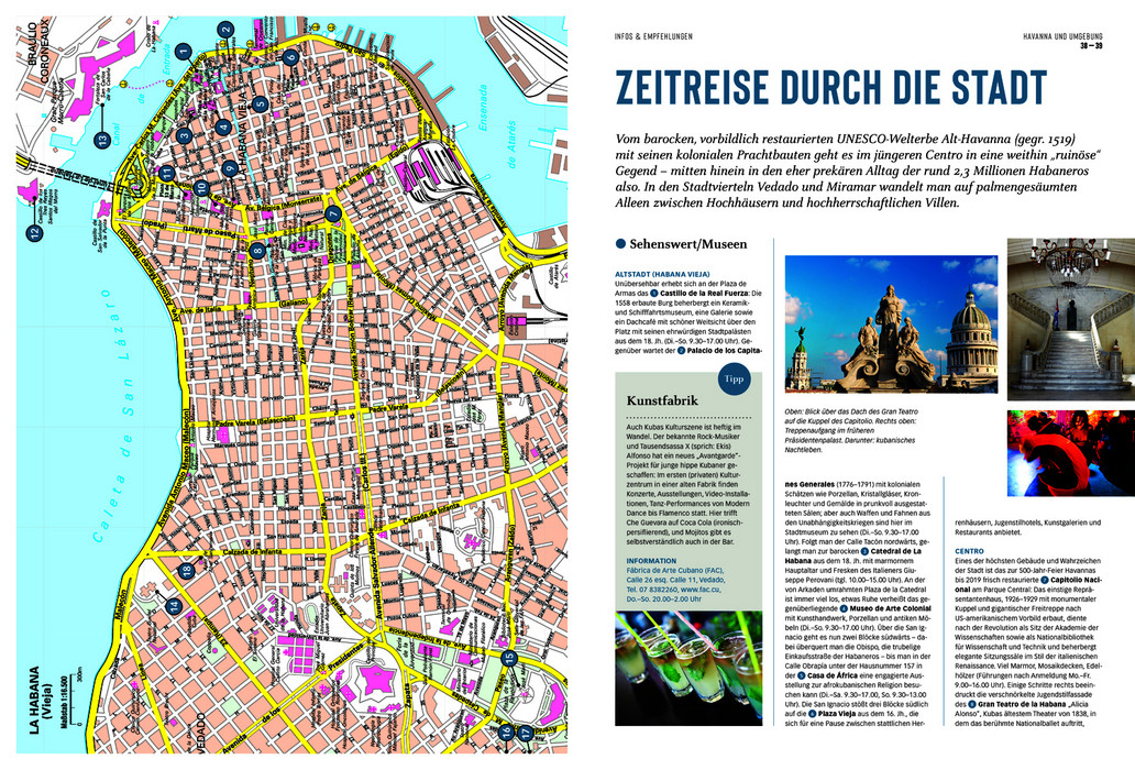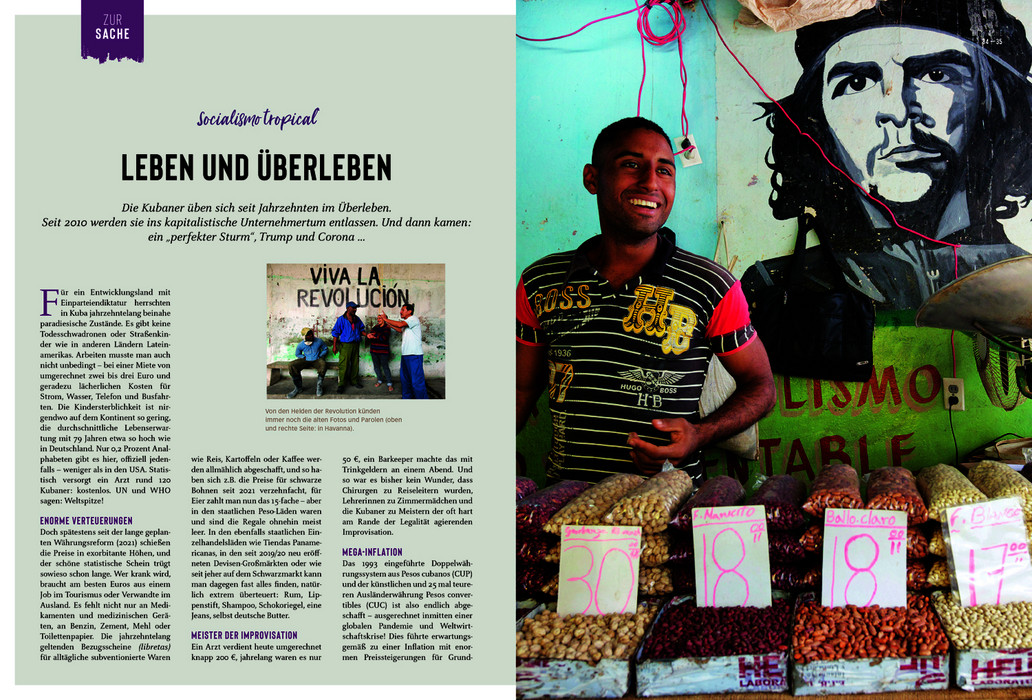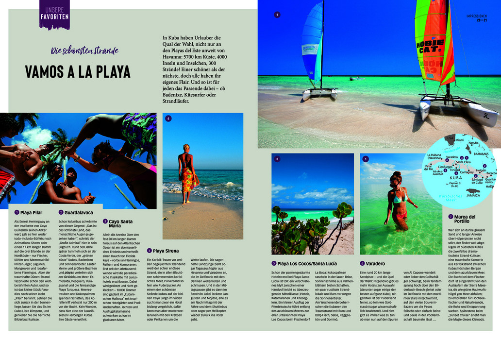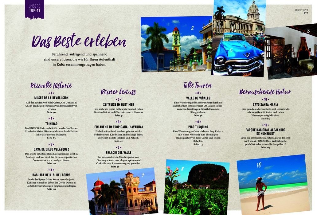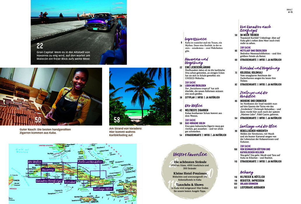 Martina Miethig nimmt den Leser mit auf eine Reise, die nicht nur durch schöne Fotos, sondern auch durch kenntnisreiche und kritische Reportagen und Specials die Besonderheiten dieser Insel wiedergeben. Dazu reisepraktische Tipps rund um Ausflüge und Märkte, Museen und ausgesuchte Hotels und Restaurants mit allen wichtigen Anschriften, Öffnungszeiten und Internet-Links. Den Abschluss eines jeden Kapitels bilden Infoseiten mit allen wichtigen Sehenswürdigkeiten, die auf der nebenstehenden detaillierten Reisekarte leicht zu lokalisieren sind. Besondere Empfehlungen enthalten die Aktiv-Kästen: Lernen Sie trommeln und tanzen wie die Kubaner, tauchen Sie ab in eine faszinierende Unterwasserwelt, besteigen Sie den höchsten Berg der Insel oder wagen Sie sich in das Höhlensystem der Gran Caverna de Santo Tomás. Abgerundet wird der Bildatlas durch das abschließende Servicekapitel, das praktische und allgemeine Informationen zum Alltag und für die Vorbereitung der Reise beinhaltet. Kompakt zusammengefasst und übersichtlich überzeugt der DUMONT Bildatlas als zuverlässiger Reisebegleiter und garantiert erlebnisreiche Tage auf dem Inselstaat in der Karibik!