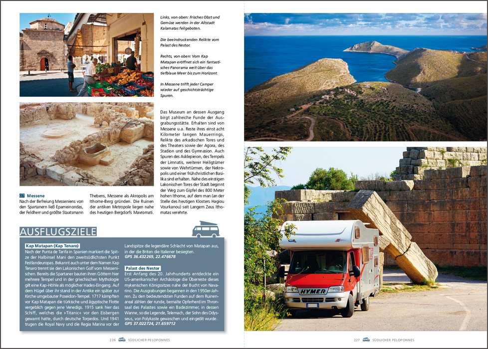 Es gibt kaum ein Land, das mehr dafür prädestiniert ist, es mit dem Wohnmobil zu bereisen als Griechenland. Paradiesische Landschaften umgeben von der tiefblauen Ägäis, antike Stätten wie Delphi oder Mykene, die berühmten Meteora-Klöster, pulsierende Metropolen wie Athen oder Thessaloniki oder verwunschene Fischerdörfer, in denen die Uhren noch ein wenig langsamer zu ticken scheinen als anderswo. Dazu kommt das köstliche Essen mit frischen Meeresfrüchten, Lamm, Mezédes und Oliven und natürlich einem eiskalten Ouzo, dem griechischen Nationalgetränk. Dieses Buch stellt die schönsten Wohnmobilrouten durch das Land vor, führt auf idyllische Stell- und Campingplätze und präsentiert sehenswerte Ausflugsziele rechts und links der Routen.