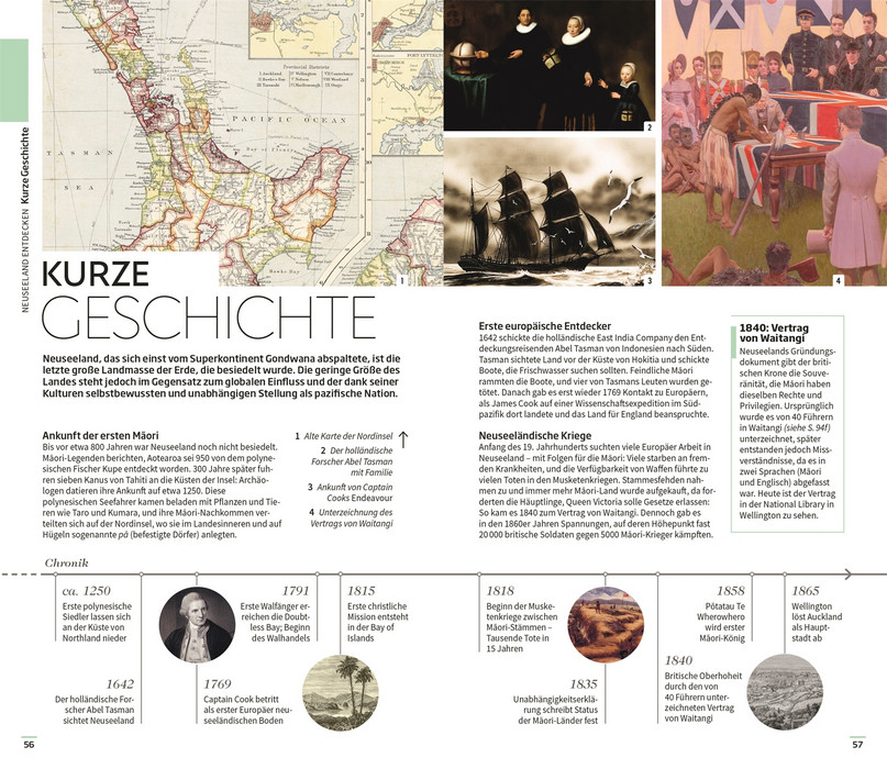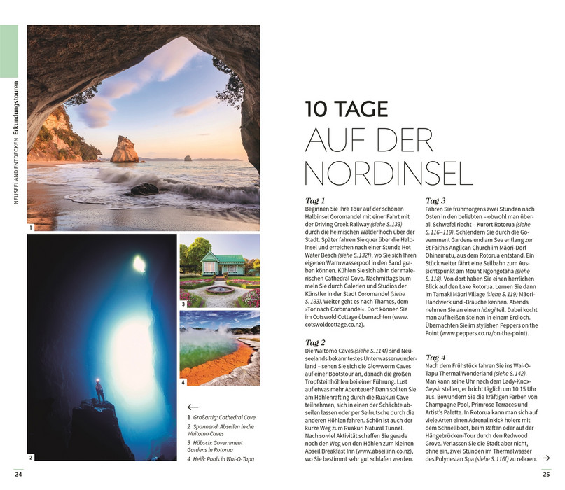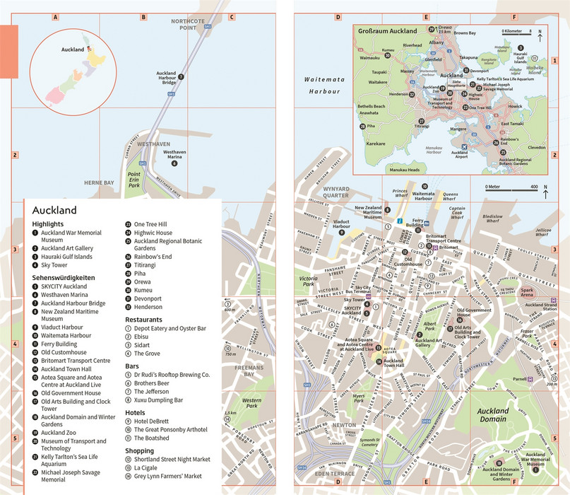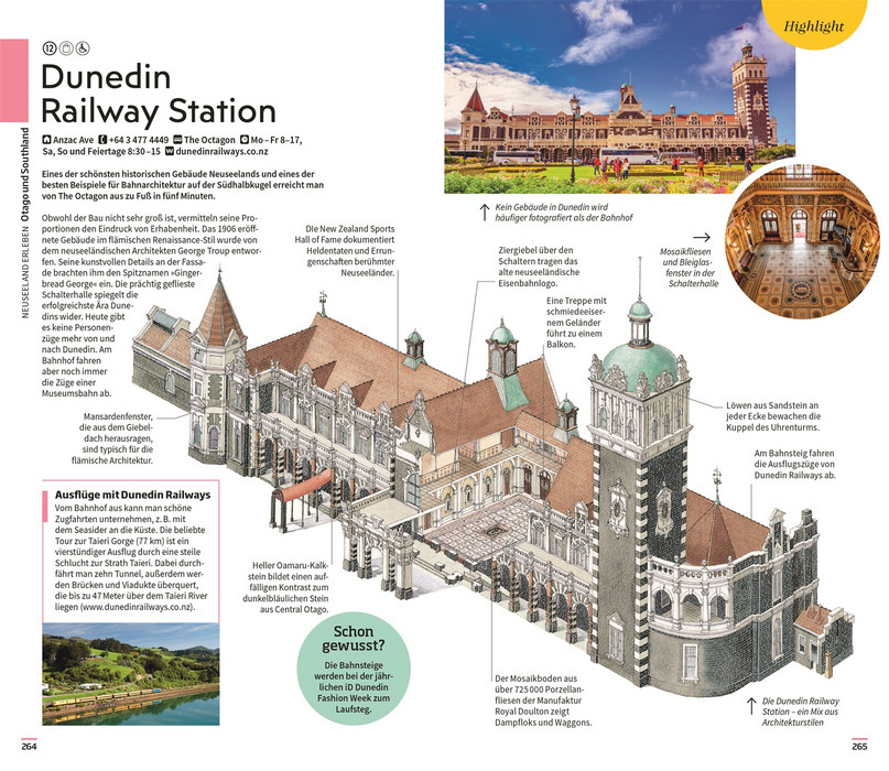 Auf der Nordinsel durch subtropische Kauri-Wälder laufen und zischende Geysire bewundern oder gewaltige Berge mit eisblauen Gletscherseen auf der Südinsel bestaunen – Neuseeland ist einfach magisch. Mit ausführlichem Expertenwissen, den berühmten 3-D-Aufrisszeichnungen und über 400 stimmungsvollen Fotos können Sie das Land Ihrer Träume hautnah erleben. Dieser Reiseführer Neuseeland ist der ultimative Begleiter für alle Kulturinteressierten! 1. Unverwechselbar visuelles Konzept. 2. Inspirierende Fotos versetzen direkt ans Reiseziel. 3. Einzigartige 3-D-Aufrisszeichnungen der spannendsten Bauwerke und gezeichnete Spaziergänge durch die schönsten Stadtteile. 4. Atmosphärische Themenseiten zum Reiseziel: von Kultur bis Genuss. 5. Hohe Benutzerfreundlichkeit durch klare Struktur. 6. Alle Highlights und Sehenswürdigkeiten Region für Region. 7. Detaillierte Karten mit allen vor Ort wichtigen Infos. 8. Alles Wichtige für die Reiseplanung kompakt. 9. Mehr Reisekomfort durch geringeres Gewicht und hochwertige Verarbeitung. 10. Vis-à-Vis bietet in höchster Qualität, was Reisende über Kulturgeschichte und Lebensart wissen wollen. Lassen Sie sich mit dem praktischen und informativen Neuseeland-Reiseführer zu den schönsten Erlebnissen, Attraktionen und Sehenswürdigkeiten Neuseelands führen – ob auf der Nordinsel die Maori-Kultur beim haka in Rotorua erleben, in heißen Thermalquellen baden und den Ausblick auf hohe Vulkane genießen oder in Auckland ein Rugby-Spiel besuchen. Auf der Südinsel beeindrucken schneebedeckte Gipfel und Gletscher der Southern Alps sowie magische Fjorde, im hübschen Christchurch warten witzige Cafés und fantasievolle Street-Art auf Sie und bei einem Bungee-Sprung von der Kawarau Bridge können Sie Ihr Adrenalin in die Höhe schießen lassen. Die fabelhaftesten Gegenden Neuseelands stellen sich Ihnen in diesem Reiseführer in ihrer gesamten Pracht vor – mit fundierten und qualitativen Inhalten sowie unvergesslichen Highlights aus Kultur und Alltag: von Northlands Cape Reinga bis hinunter nach Wellington im Süden von Neuseelands Nordinsel. Nicht zu vergessen die pulsierende Hafenstadt Auckland, der ein eigenes Kapitel gewidmet ist. Neuseelands Südinsel erstreckt sich von der Golden Bay in Nelson über die beeindruckenden Southern Alps zwischen Westküste und Canterburry bis nach Stewart Island in Southland. Egal ob zehn Tage, drei Wochen oder länger – eine Reise nach Neuseeland lohnt sich! Ob Sie wenig oder viel Zeit haben, um das Land zu erkunden: In diesem Reiseführer finden Sie facettenreiche Vorschläge, um das Beste aus Ihrem Trip herauszuholen. So lernen Sie beispielsweise auf einer zehntägigen Reise auf der Nordinsel nicht nur die schöne Halbinsel Coromandel und Wellington kennen, Sie entdecken unter anderem auch die Waitomo Caves, Neuseelands bekanntestes Unterwasserwunderland, bestaunen Geysire und lernen die Maori-Kultur kennen. Sensationelle 3-D-Aufrisszeichnungen bieten aus der Vogelperspektive ganz neue und einmalige Einblicke in Neuseelands Sehenswürdigkeiten – von der Dunedin Railway Station bis zum Sky Tower in Auckland. Auf den bildgewaltigen Themenseiten des Neuseeland-Reiseführers stehen charakteristische Besonderheiten im Fokus. Bestaunen Sie die wilde Tierwelt, lernen Sie Neuseelands ausgezeichnete Weine und Weingüter kennen oder entdecken Sie die Filmkulissen von Blockbustern wie Die Chroniken von Narnia oder Herr der Ringe. Handgezeichnete Spaziergänge führen Sie entlang beeindruckender Sehenswürdigkeiten und zeigen alles Wichtige über Architektur, Kirchen, Museen und Plätze – wie beispielsweise bei einem Spaziergang durch das Zentrum Dunedins oder Napiers. Eine zweitägige Tour durch Auckland hilft Ihnen, in kurzer Zeit möglichst viele Highlights zu erleben. Ob traumhaft schöne Strände und Buchten, unberührte Regenwälder, magische Fjorde oder gewaltige Gletscher: Atmosphärische Sehnsuchtsbilder wecken Ihr Fernweh! Dank der wunderschönen und faszinierenden Fotos bringt Sie dieser Neuseeland-Reiseführer gedanklich schon beim Durchblättern direkt ans Reiseziel. Detaillierte, übersichtliche Karten ermöglichen es Ihnen, sich in den verschiedenen Regionen Neuseelands zu orientieren. Ins Detail gehende Stadtpläne weisen bereits auf einen Blick den Weg zu Restaurants, Hotels, Shops oder Sehenswürdigkeiten. Im Reiseführer Neuseeland finden Sie zusätzlich nützliche Informationen zu Themen wie Anreise, Gesundheit oder Mobilität vor Ort – und zwar übersichtlich auf einen Blick. Ihr formschöner und hochwertiger Neuseeland-Reiseführer ist ein echtes Leichtgewicht und lässt sich deshalb prima mitnehmen.