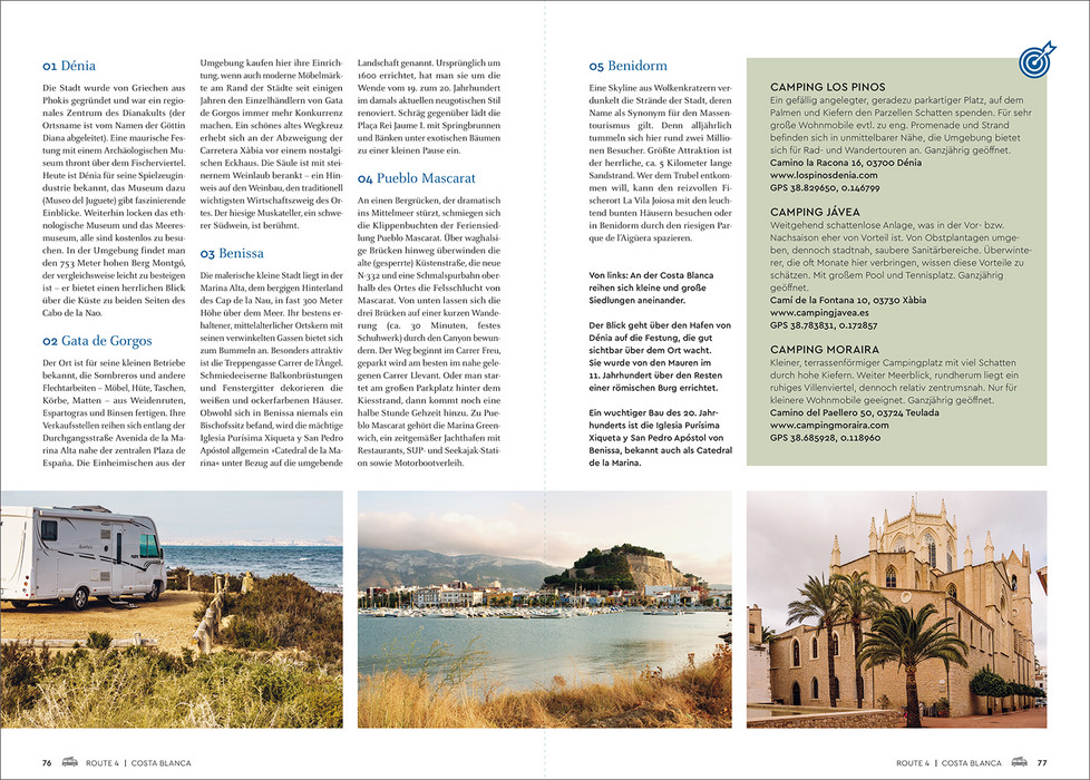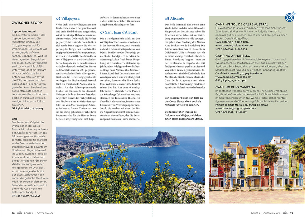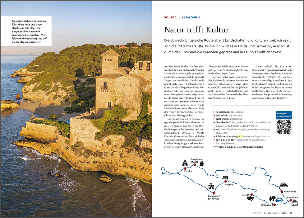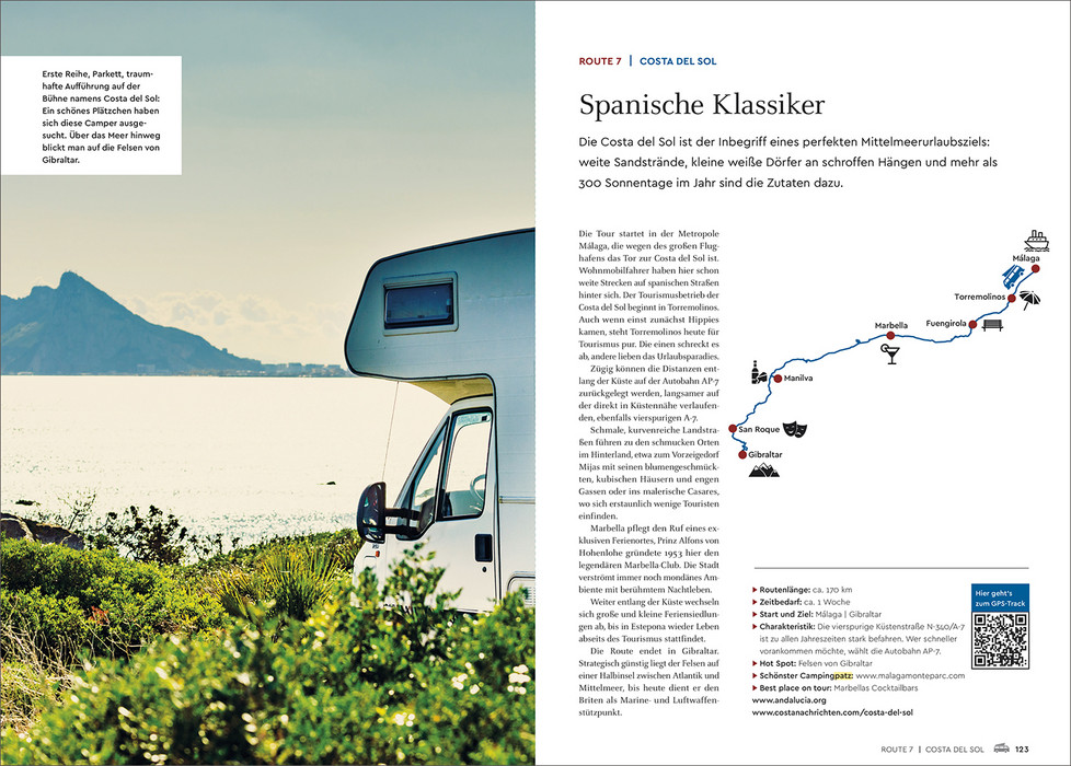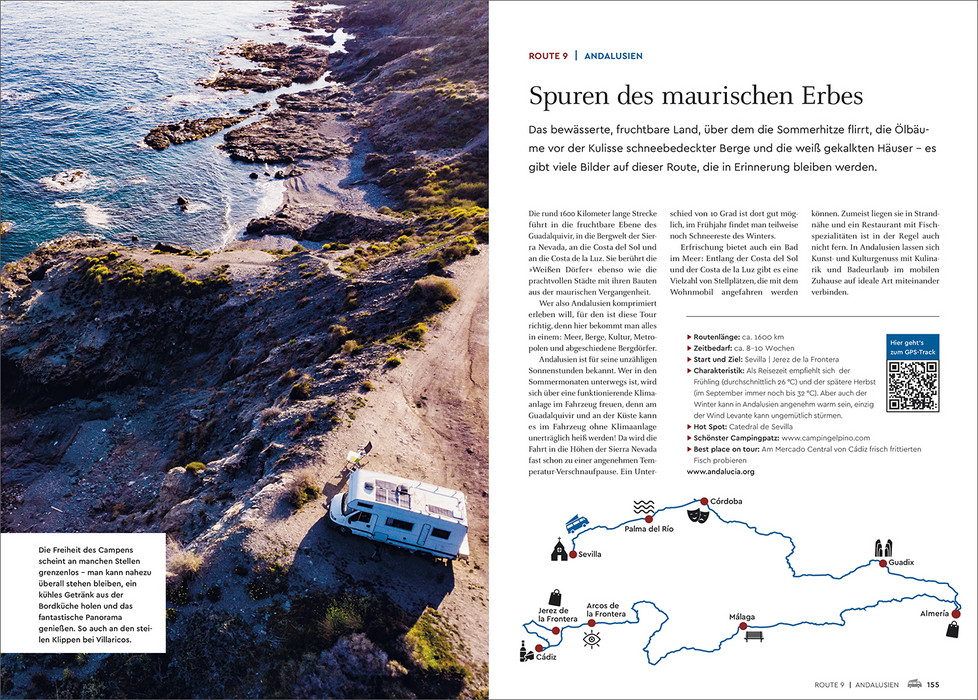 Spanien ist nicht umsonst seit vielen Generationen ein beliebtes Urlaubsziel. Zu den schier endlosen Küsten wie der Costa Brava, der Costa Blanca oder der Costa de la Luz mit ihren einladenden Stränden gesellen sich weiße Dörfer vor blauem Himmel, warten eindrucksvolle Städte wie Sevilla, Granada oder Barcelona darauf, entdeckt zu werden, laden ursprüngliche Landschaften zu Erkundungen ein. Darüber hinaus lockt natürlich die reiche Inselwelt Spaniens – die Balearen im Mittelmeer, die Kanaren im Atlantik. Abwechslungsreiche Strecken führen durch grandiose Naturlandschaften, in pittoreske Orte und quirlige Städte. Die wichtigsten Sehenswürdigkeiten, lohnende Abstecher und fantastische Naturerlebnisse sind anschaulich präsentiert. Zu jeder Route werden attraktive Wohnmobilstellplätze vorgeschlagen. Tourenkarten, GPS-Tracks und ein Reiseatlas geben optimalen Überblick über den Streckenverlauf. Mit brillanten Farbbildern und nützlichen Informationen gespickt, gibt das Buch vielseitige Anregungen, wohin die Spanienreise mit dem mobilen Heim gehen kann.