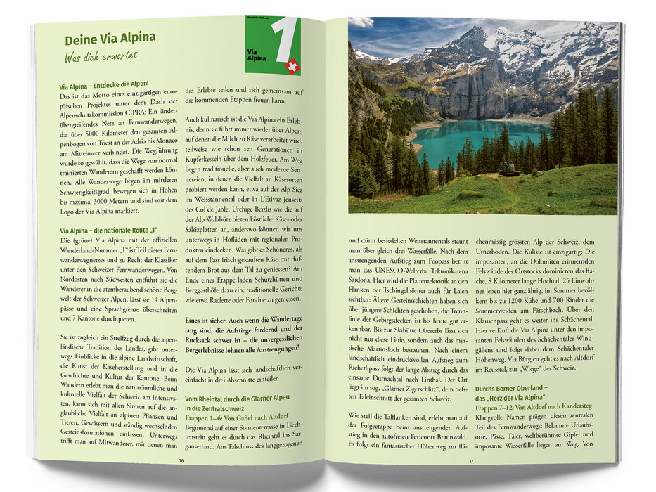 Over 20 stages and almost 390 km, the journey goes from Vaduz in Liechtenstein across Switzerland along the green path of the Via Alpina to Montreux. This mostly high-mountain tour, crossing 14 Alpine passes, passes through picturesque villages and offers breathtaking views of the Swiss Alps.
