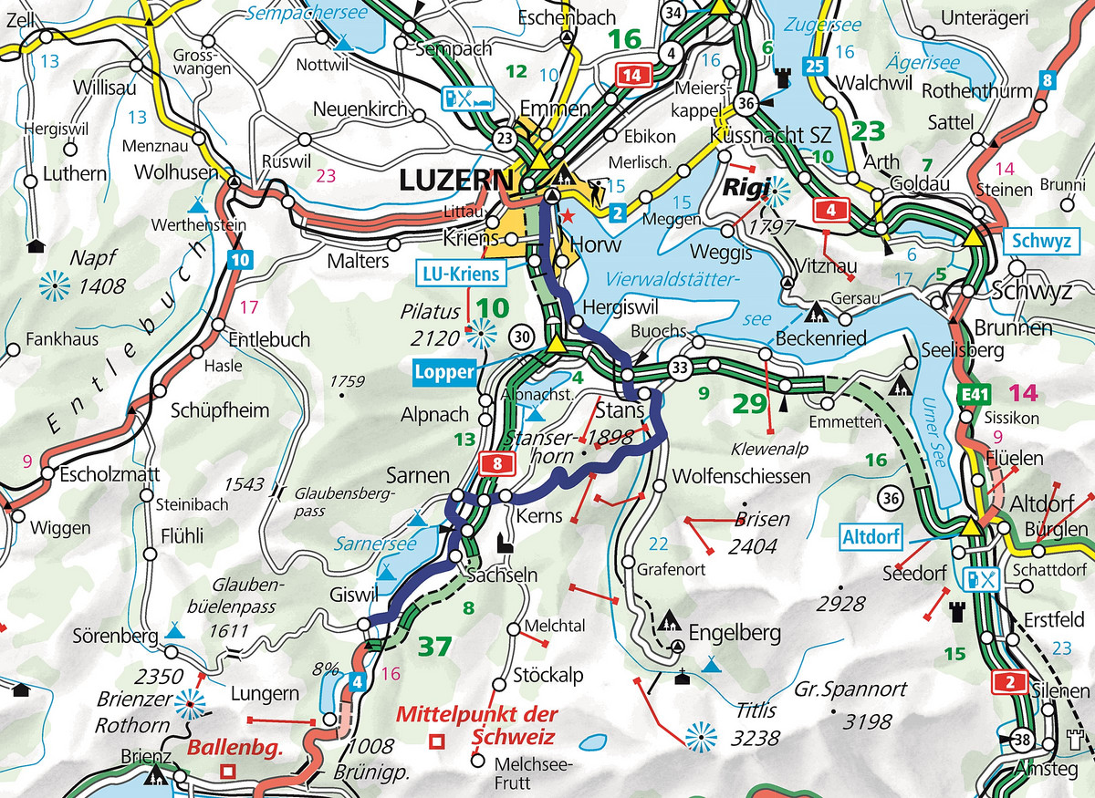 The Ächerlipass offers even more. With "only" 1458 metres in height, it is indeed an unimportant connecting pass in Central Switzerland. Its route leads from Sand bei Kerns to Dallenwil and connects the two half cantons of Nid- and Obwalden. The asphalted road has a total length of around 20 kilometres and gradients of up to 16 percent. With the exception of alternative points, it is usually only PW wide, i.e. quite narrow. Approximately eighty percent of the western approach from Kerns is in the forest, so there are only a few ingenious vantage points offering a view of Lake Sarnen. Only from the top of the pass is the distant view unique in good weather: the mountain massifs Pilatus (2137 m), Rigi (1797 m), Stanserhorn (1898 m), Buochserhorn (1806 m) and the snow-covered Titlis (3238 m) can be seen. The view remains uninterrupted, as the east descent to Dallenwil is wonderfully open in contrast to the wooded approach from Kerns. It is also steeper and many small hairpin bends demand man and machine. Therefore the Ächerli is not to be recommended to insecure beginners with heavy machines.