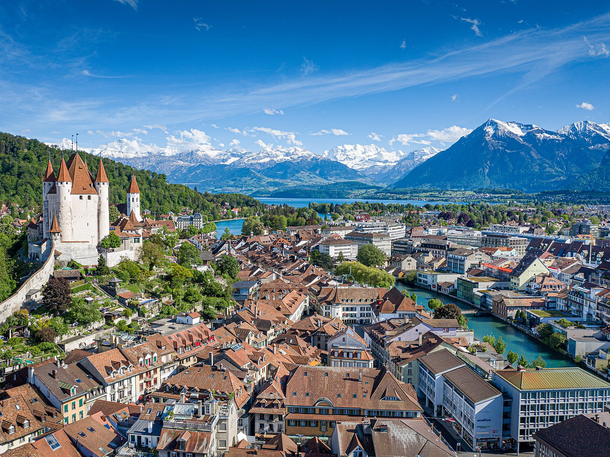 An exciting panoramic route from Thun to Interlaken for mountain bikers, with stunning views of Lake Thun and the Bernese Oberland High Alps.