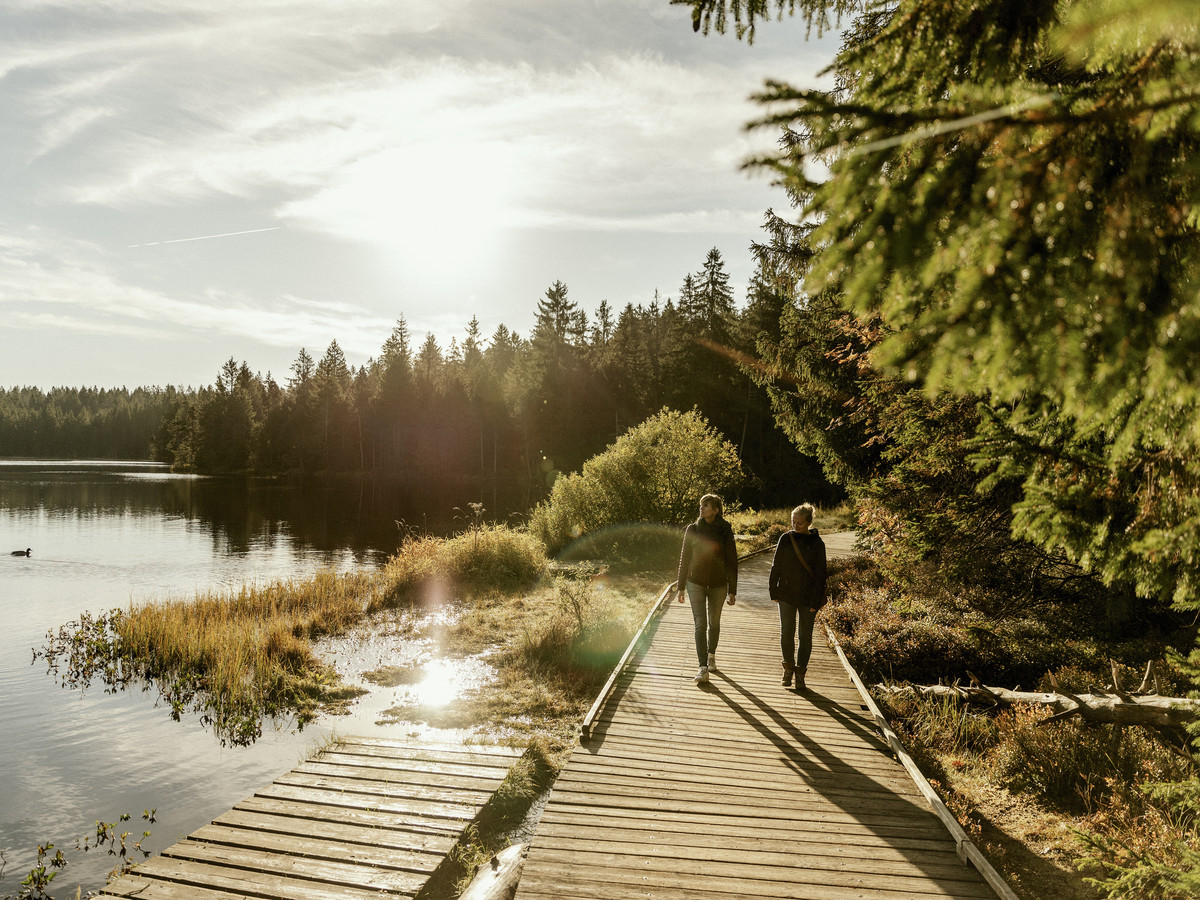 Highlight in the Franches-Montagnes: the moor lake with a romantic forest path. On warm days the local youth (and connoisseurs) cool off in the mysteriously dark water while swimming.