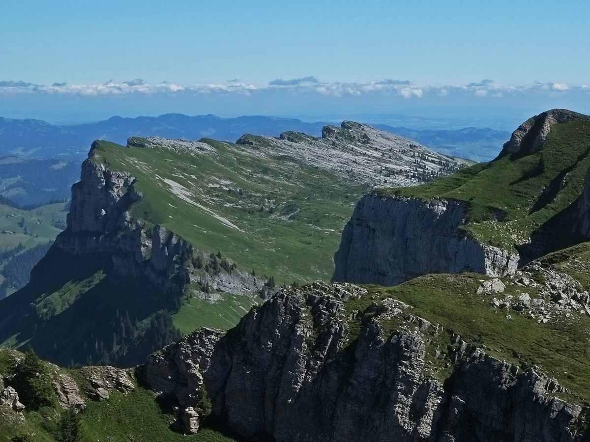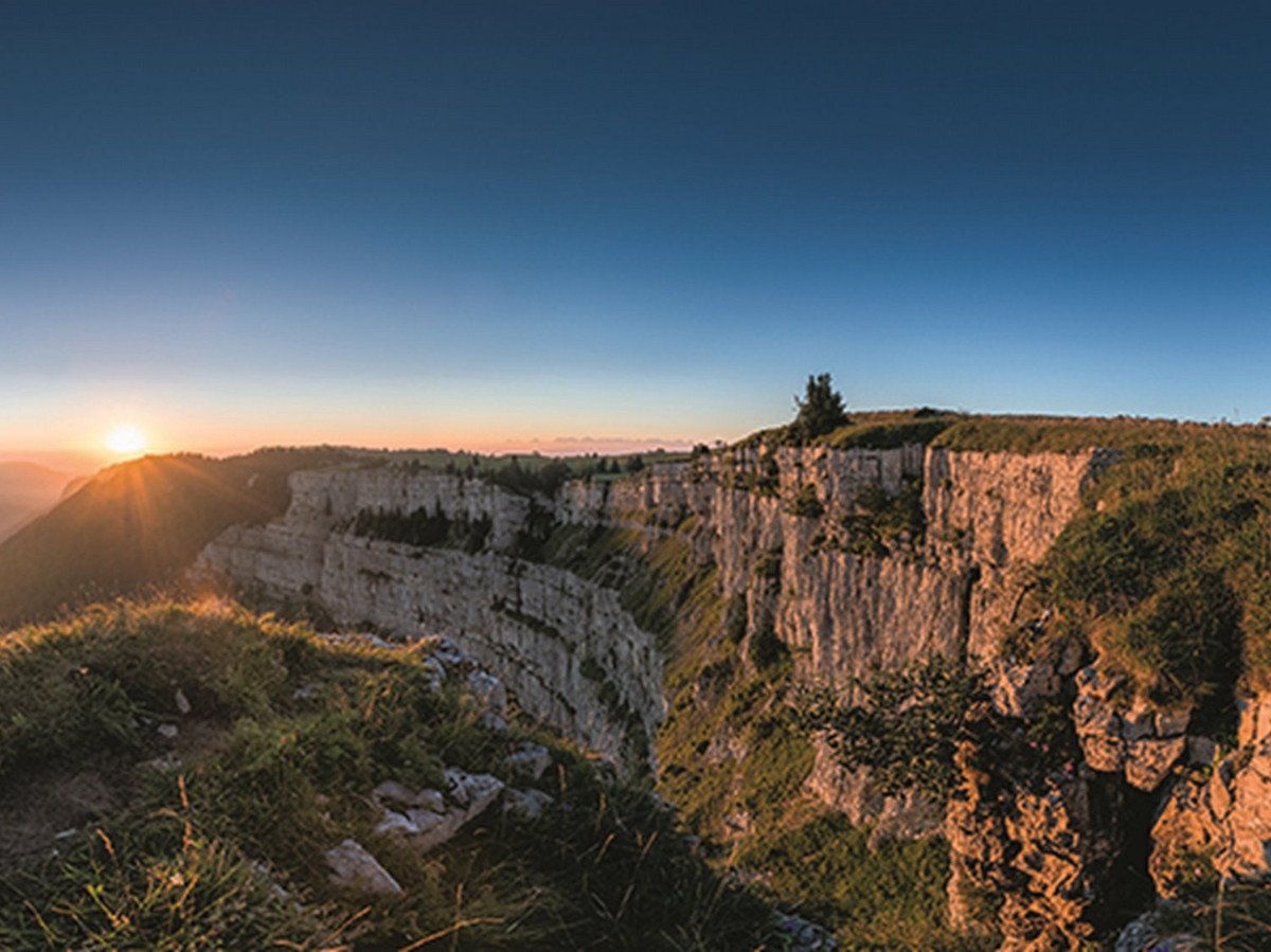 The impressive landscape of Val de Travers. Exactly 730 meters of ascent from down in the valley at Noiraigue, and you are standing in the upper tiers of the arena of superlatives.