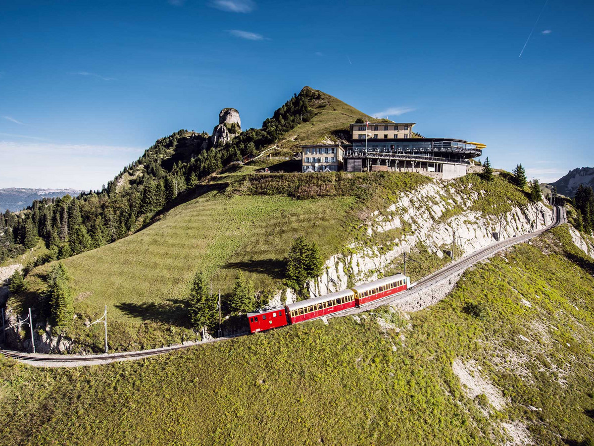 For more than 120 years, the little red railway has climbed at a gradient of up to 25 per cent to the point with an alpine garden, a variety of hikes, a viewing terrace and a mountain hotel.