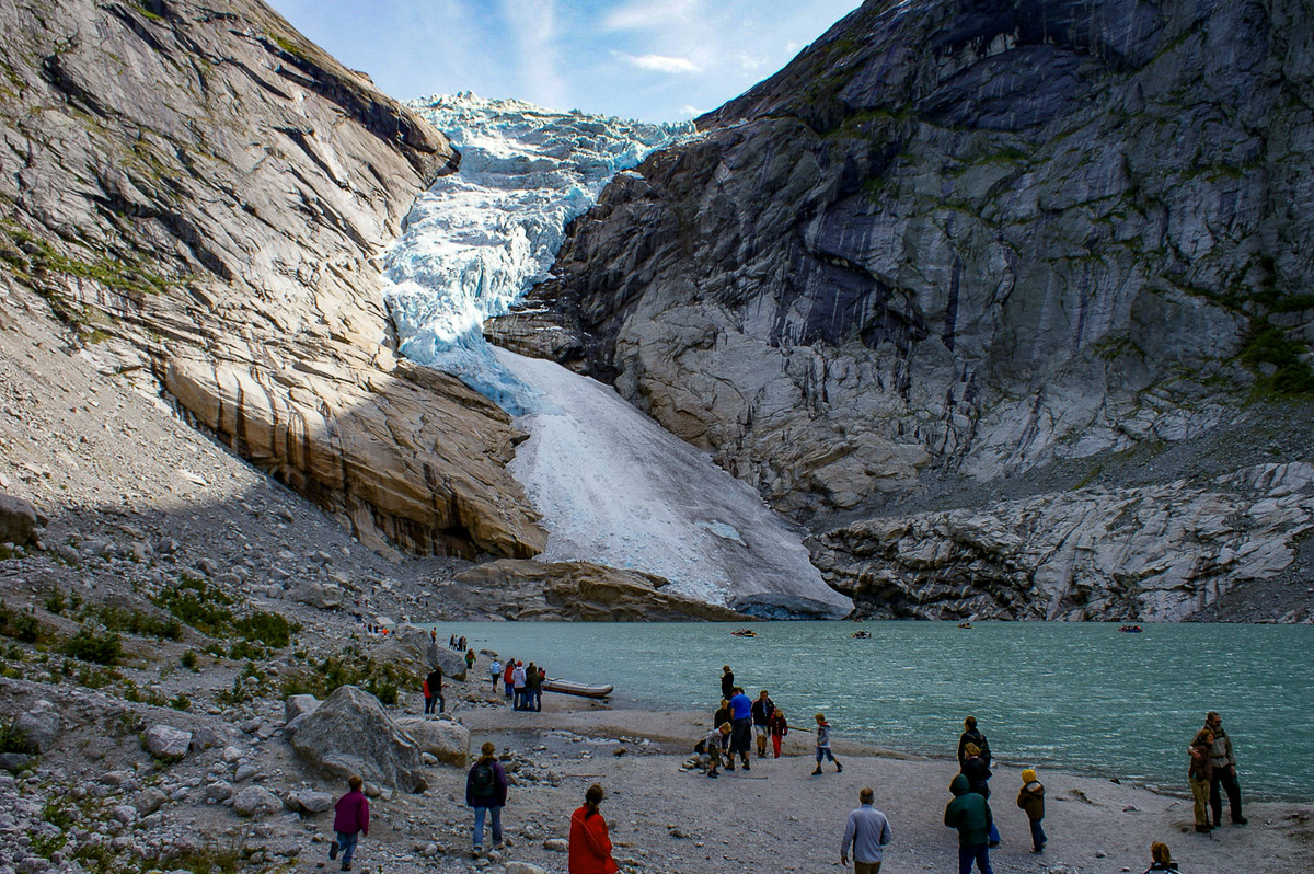 Those who preferred the sea route will turn back onto the same road in Olden at the latest. Norway is not only known for its fjords, but also for its glaciers. With around 500 square kilometres and several glacier arms, the Jostedalsbreen is the largest glacier on the European mainland. At the very back of the Oldental valley, a well-signposted hiking trail leads to the beautiful Brikdalsbreen, which, like so many glaciers, has receded in recent years.