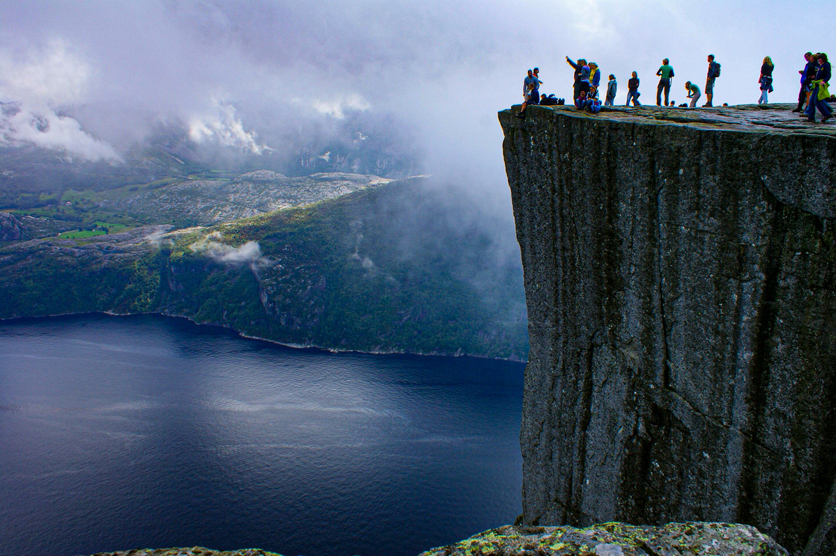 In Stavanger, a final detour to Preikestolen is worthwhile. The 4-hour round hike first leads through the forest, later through a small marshy area, then past several mountain lakes and suddenly you are standing in front of it: 604 metres above the Lysefjord, the rock platform Preikestolen is enthroned. The captivating thing about it: at the edge, the rock drops almost vertically to the water - without a railing, mind you. The souvenir picture will remind you of this unique road trip for a long time.