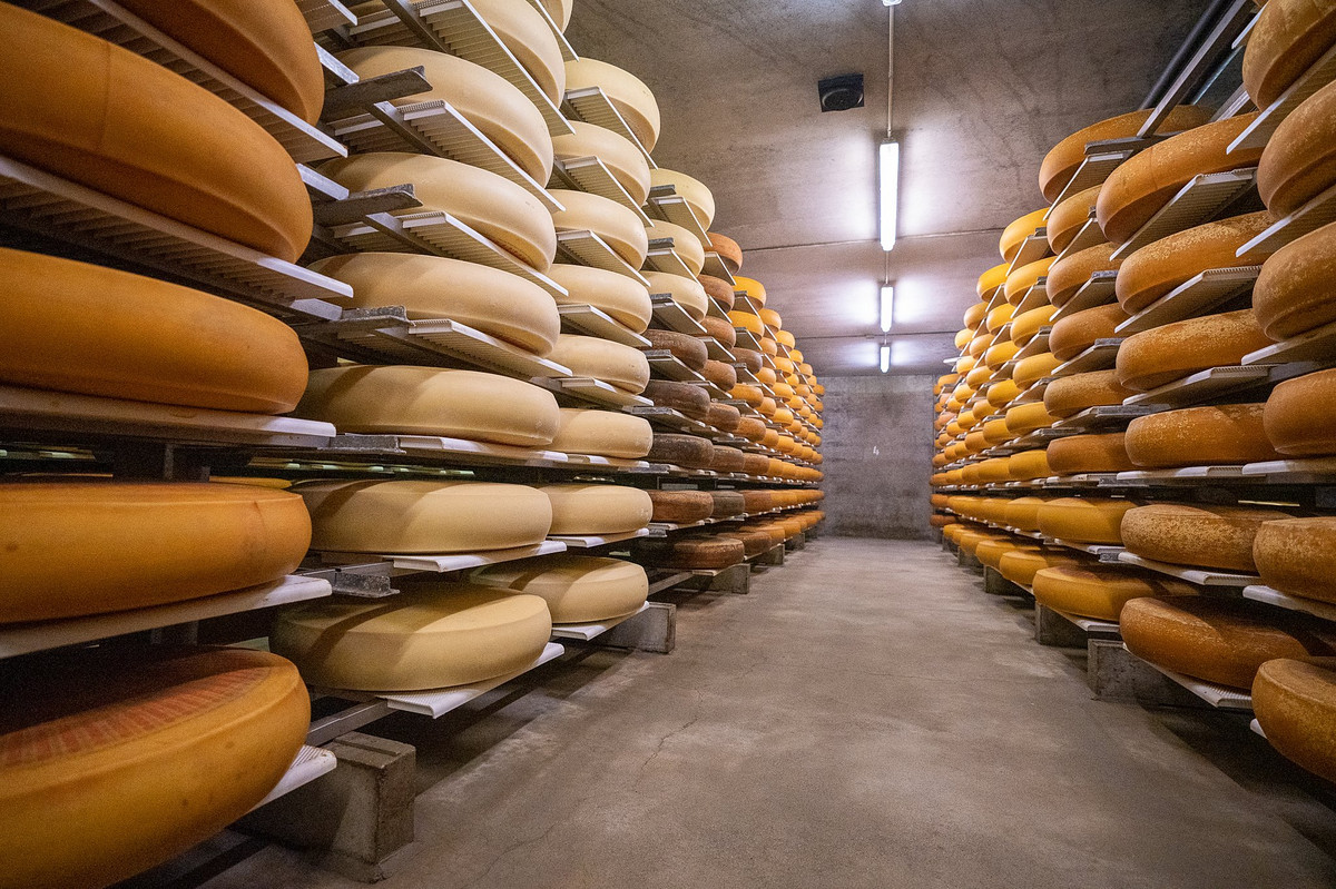 The most famous from the Emmental? Probably the most famous cheese in the world: Emmentaler AOP. Every child knows it and associates the region characterised by countless hills, valleys and grazing cows with the cheese with the large holes. And these loaves, weighing between 75 and 120 kg, mature in large numbers in a cheese warehouse in Langnau before being exported all over the world and form the starting point of our tour. What many people don't know is that the cheese cellars can be visited. On an hour-long guided tour, you will learn more about the ripening of Emmentaler AOP in the Gourmino AG cheese house. Up to 6,000 loaves of Emmentaler AOP and 3,500 loaves of Le Gruyère AOP are cared for and nurtured in the warehouses until they have reached their optimum ripening stage. Afterwards, of course, you can taste the cheese. By the way, you can still find original cheese trading houses all over Langnau - a particularly beautiful example can be found on Hansenstrasse.