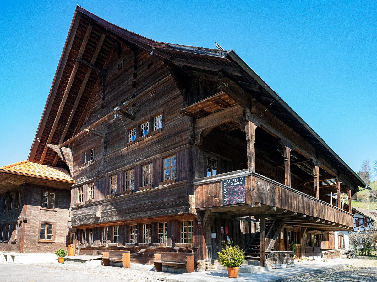 Freshly fortified and with new impressions, we stop in the immediate vicinity at the Chüechlihus, the oldest and largely original wooden building in the region, dating from 1526. It is assumed that it was built as a commercial and trading house at that time. Today, the neat house houses a regional museum with a collection all about Emmental traditions and the past. The cute name, by the way, comes from the fact that a café was run here until 1956, offering Chüechli. Fine cakes and tarts, fresh bread and the finest chocolates can be bought a few metres further on at Confiserie Wisler.